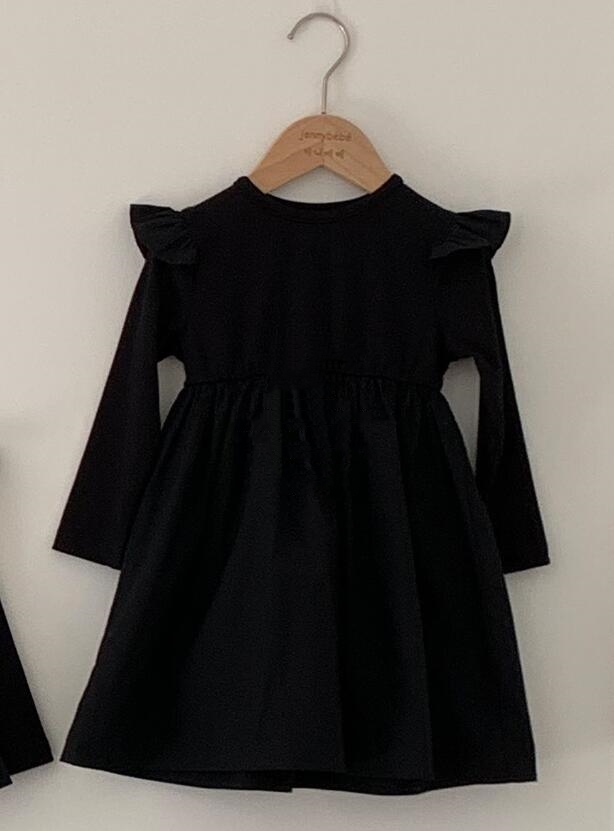 上品な黒色のロングワンピースデザインで、フリル袖が可愛らしさを演出します。