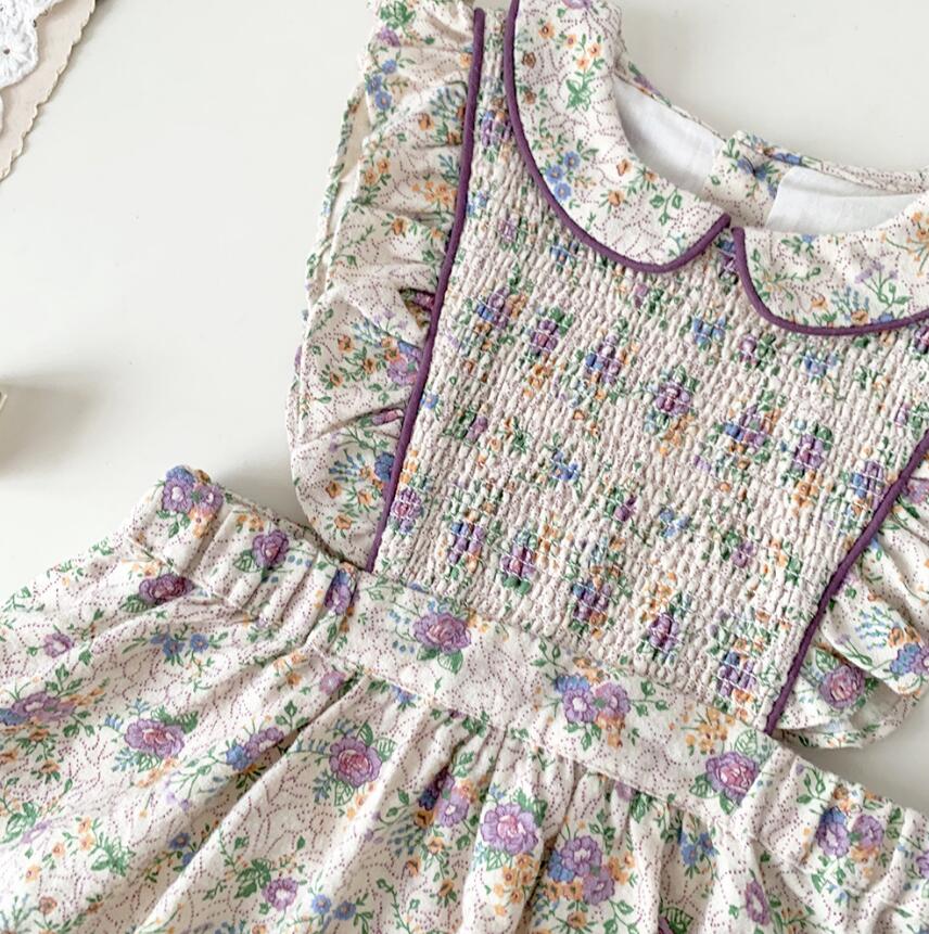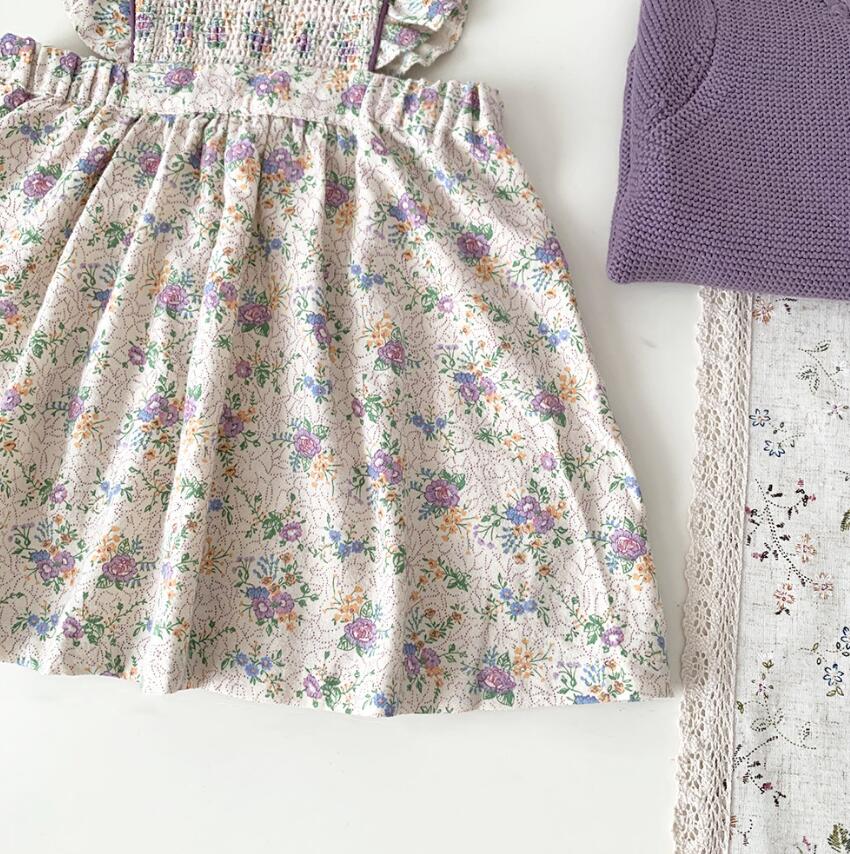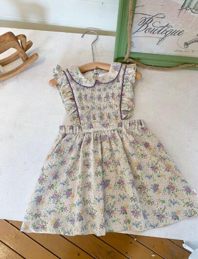 胸元のスモッキングと丸襟がクラシカルで上品な印象を演出します。
