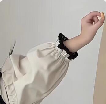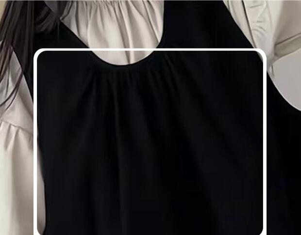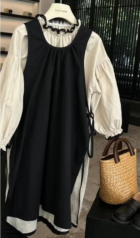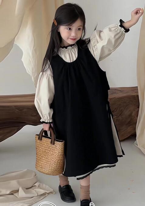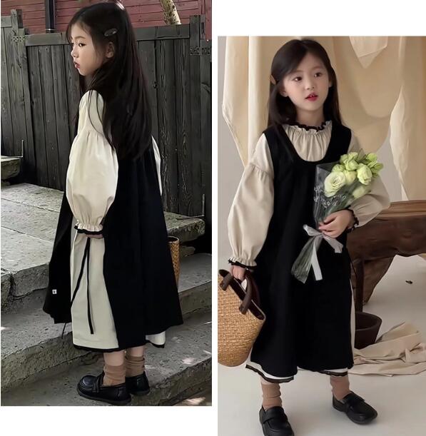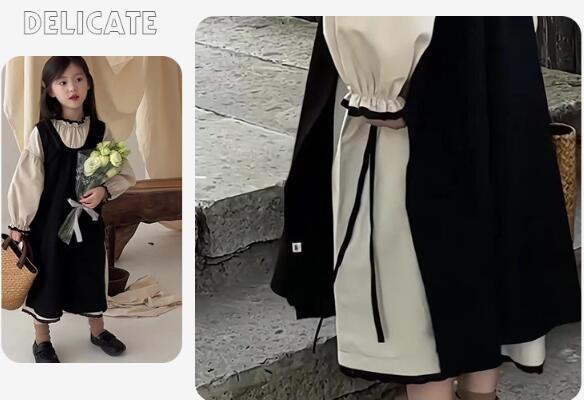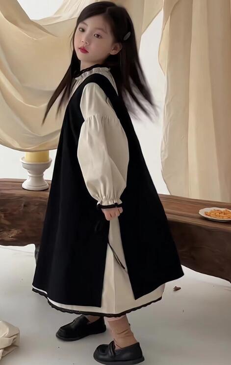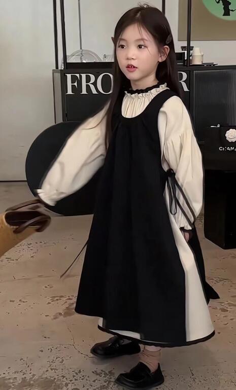 黒のジャンパースカートと白の長袖ブラウスの組み合わせが可愛らしく、
