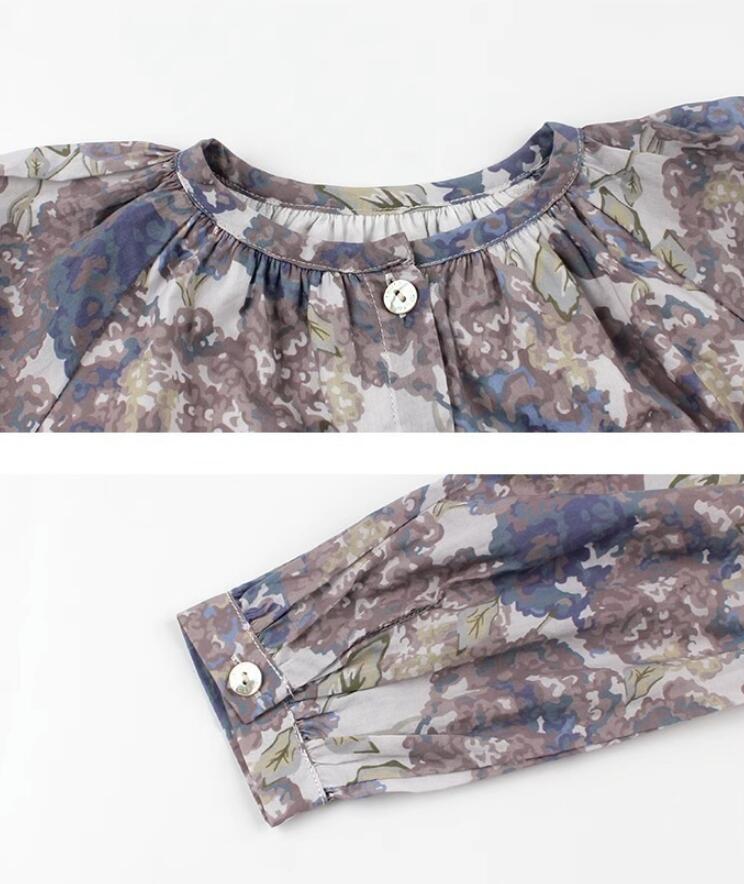 上品な花柄プリントと優しい色合いが女の子らしさを演出します。