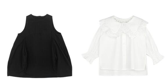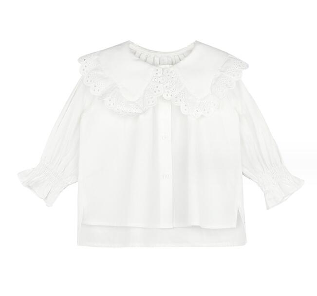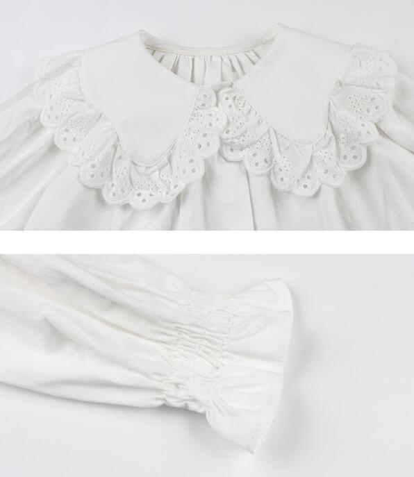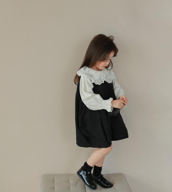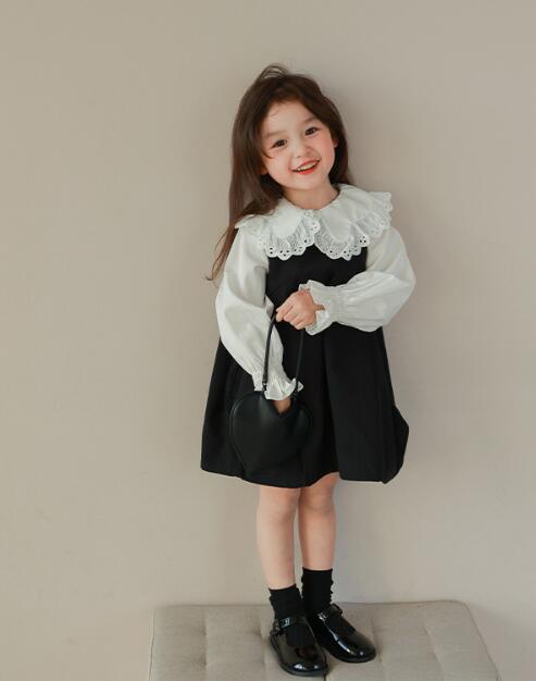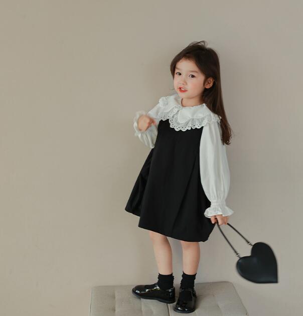 可愛らしいレース襟が印象的なキッズ向け吊りワンピースとシャツのセットです。