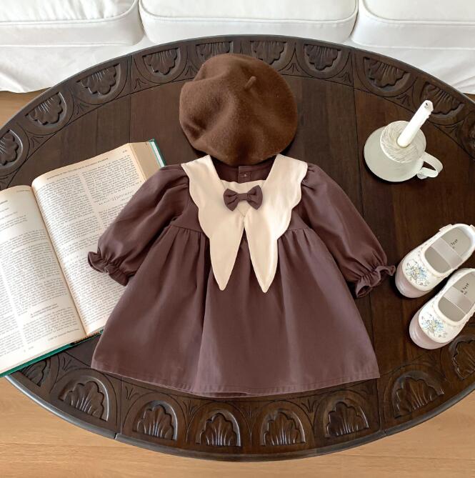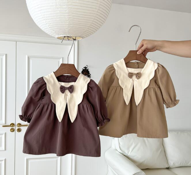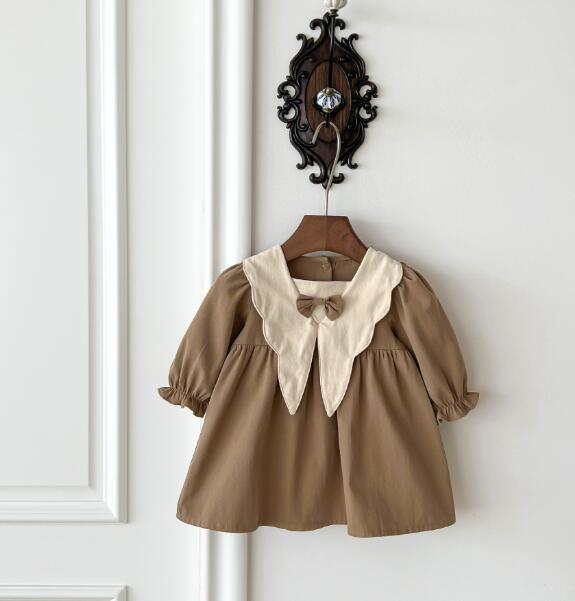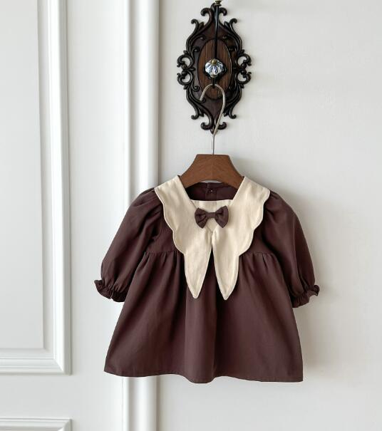 白い大きな襟とリボンがポイントの上品なデザイン。