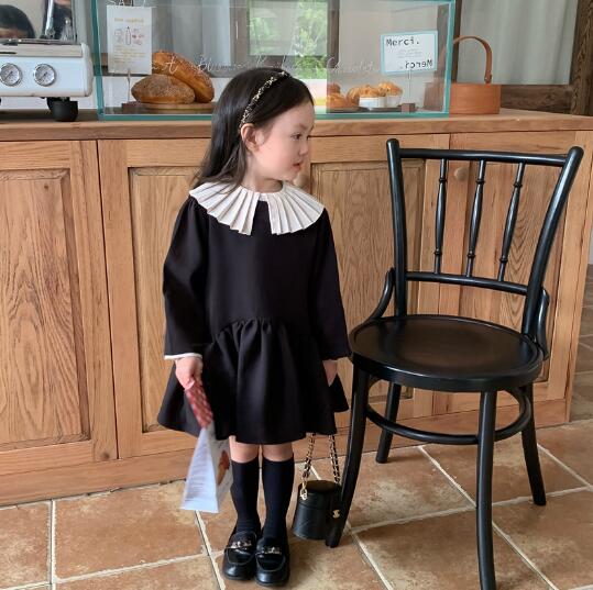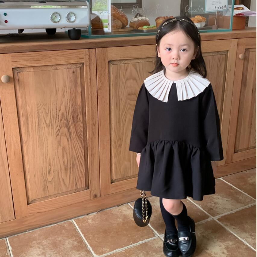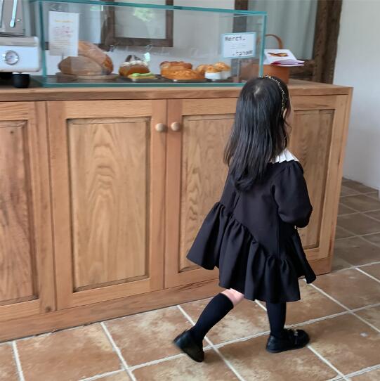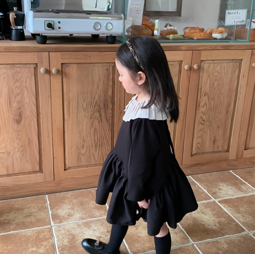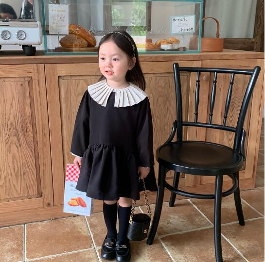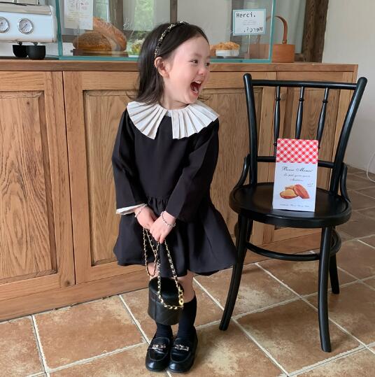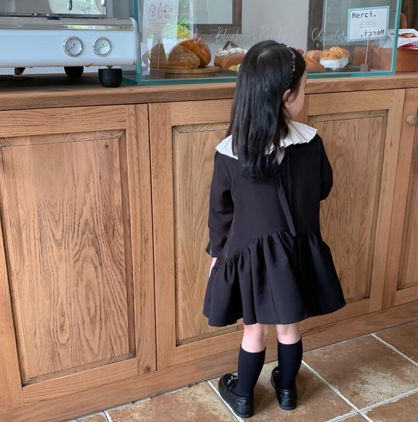 上品な白い襟が印象的なキッズ向け長袖ロングワンピースです。