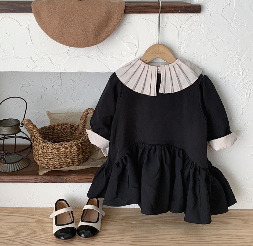 黒地にプリーツ襟のクラシカルなデザインで、フォーマルシーンにもぴったり。