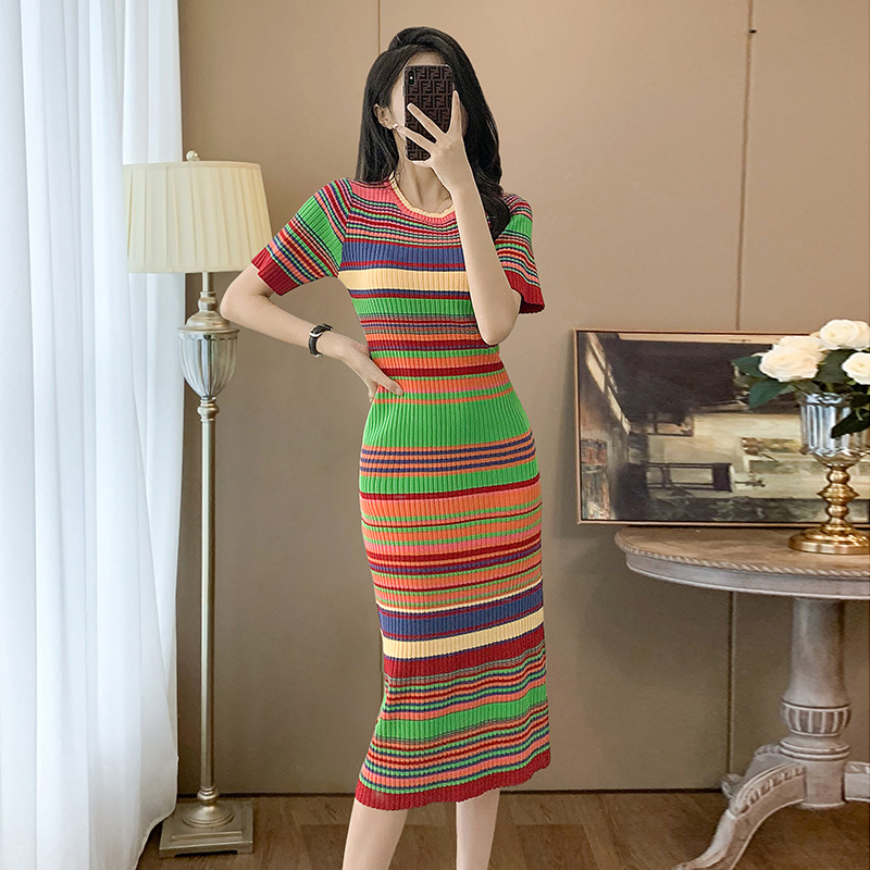 鮮やかな縞模様が印象的なロングワンピース。上質なニット素材は伸縮性に優れ、体にフィットしつつ美しいシルエットを描き出します。短い袖と適度な厚みが魅力で、季節の変わり目にぴったりの一着。デイリースタイルから特別な日まで、幅広く活躍するニットワンピースです。快適さとスタイルを両立させた、あなたのワードローブに欠かせないアイテムとなるでしょう。