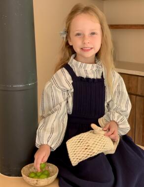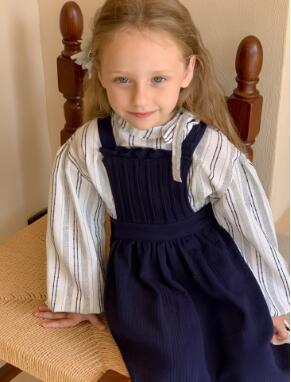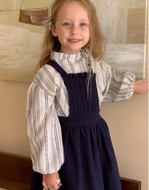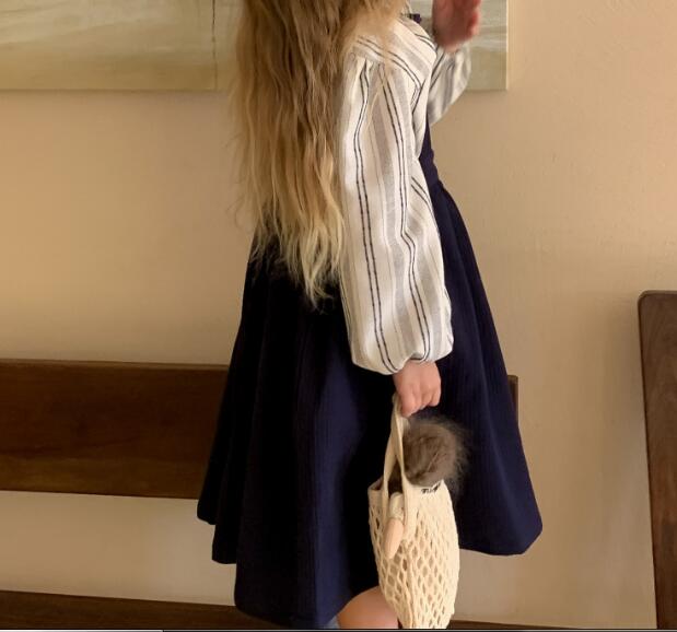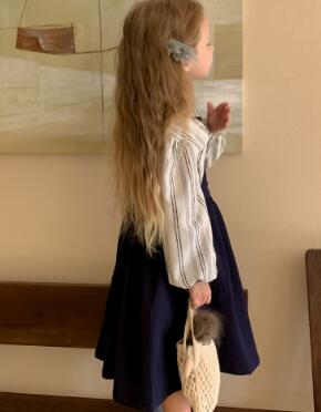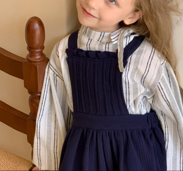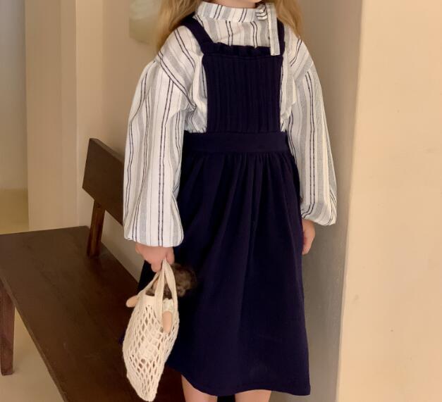 キッズ向けの可愛い吊りロングワンピースとストライプシャツのセット商品です。
