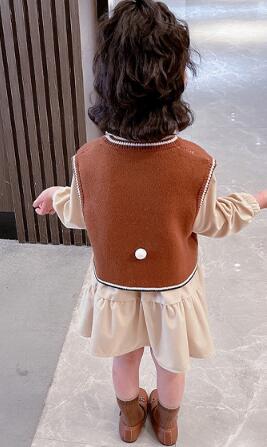 茶色のベストとクリーム色のロングワンピースの組み合わせで、上品で温かみのある仕上がりに。