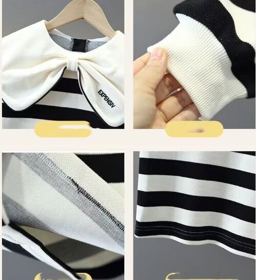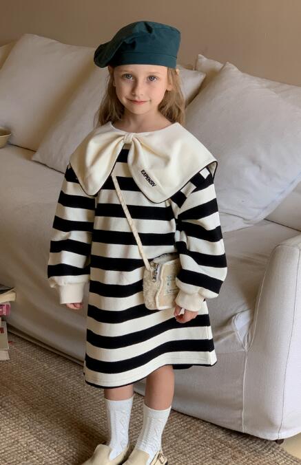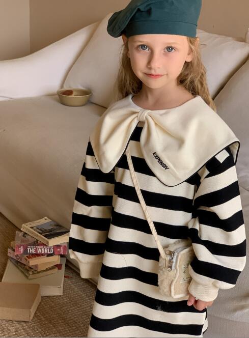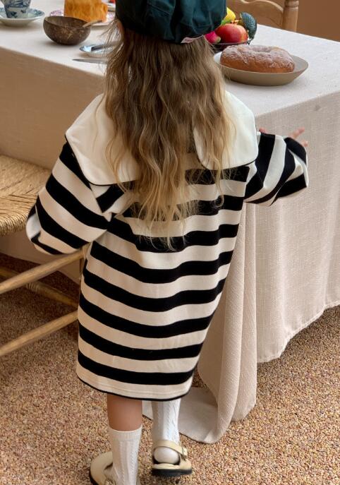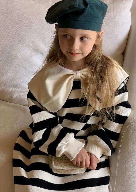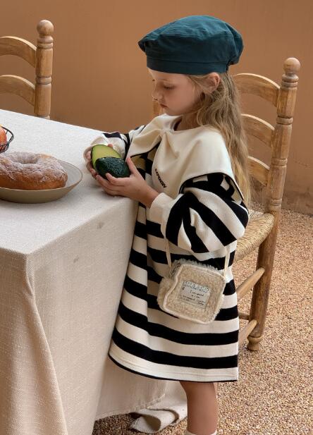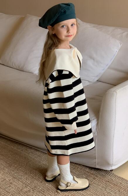 上品なボーダー柄とクリーム色の大きな襟がおしゃれで、普段着から特別な日まで幅広く活躍します。