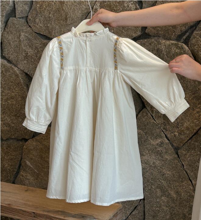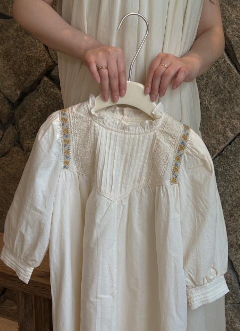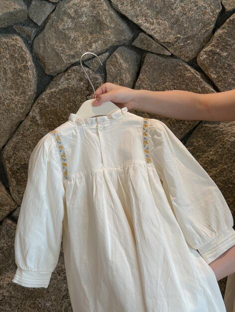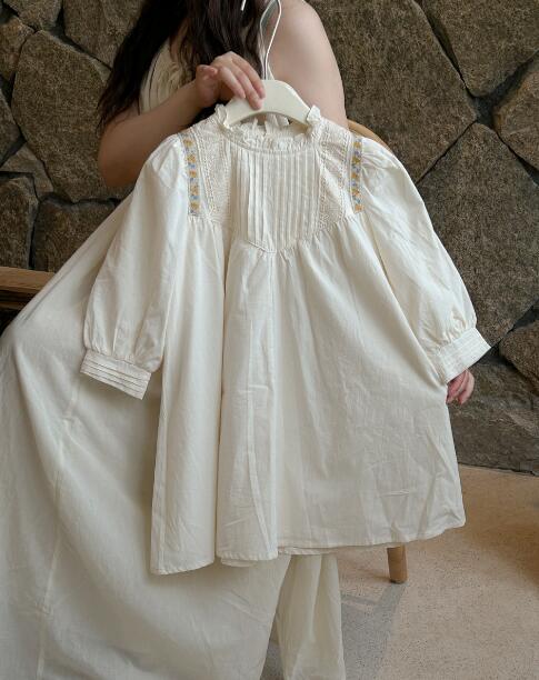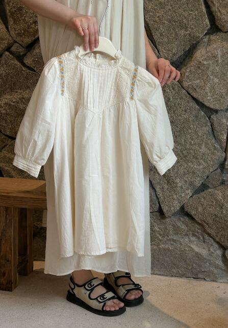 上品な白色が美しいキッズ向けロングワンピースです。 胸元の繊細な刺繍とギャザーが可愛らしさを演出します。 ゆったりとした長袖デザインで着心地も抜群。 90から140サイズまで展開しており、お子様の成長に合わせてお選びいただけます。