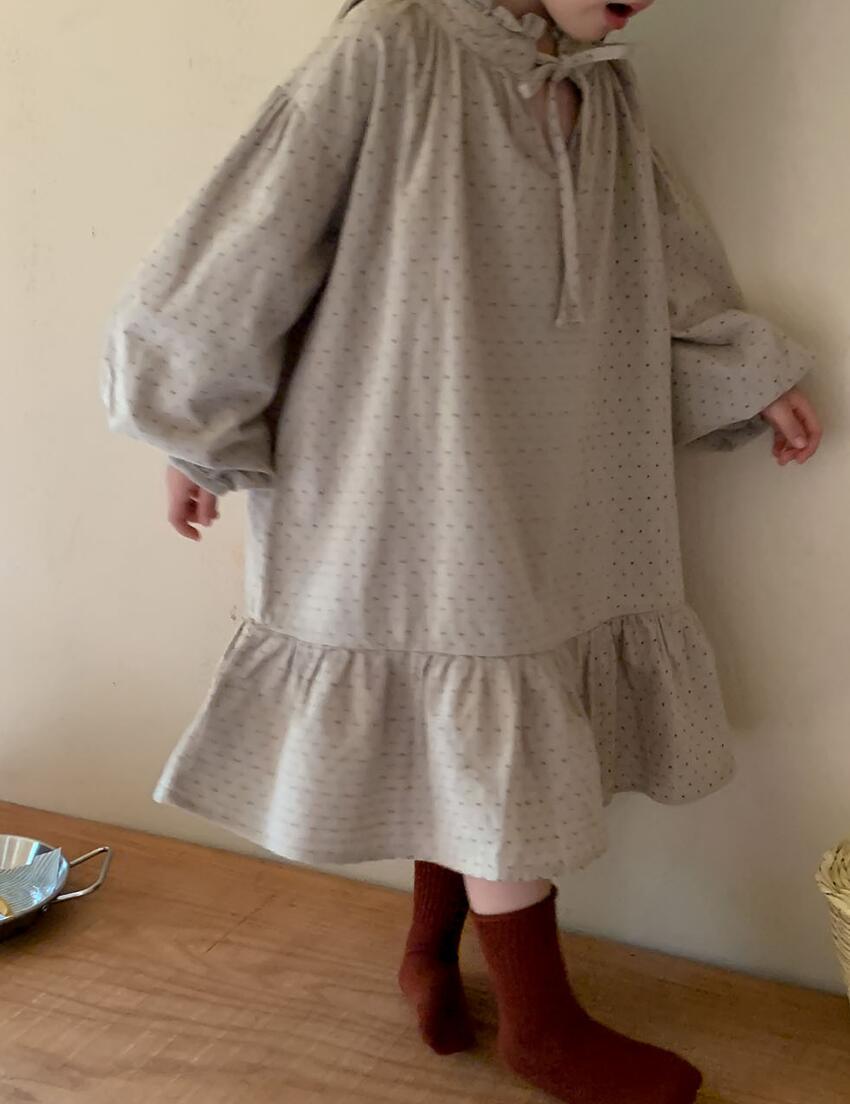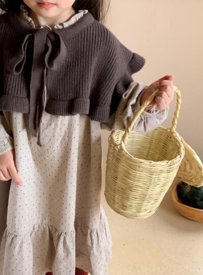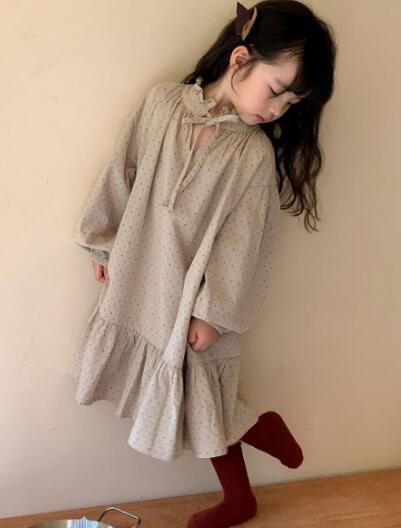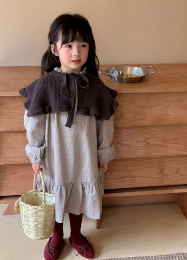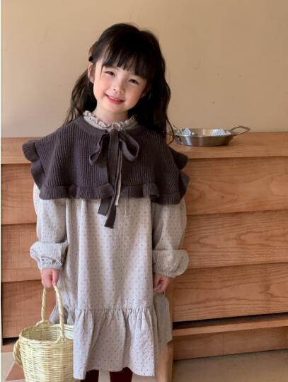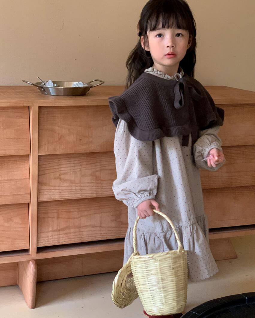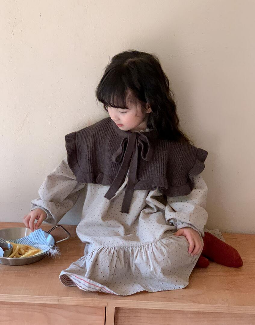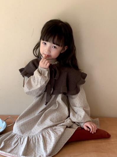 茶色のニットボレロと水玉模様のロングワンピースの組み合わせで、