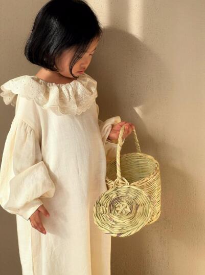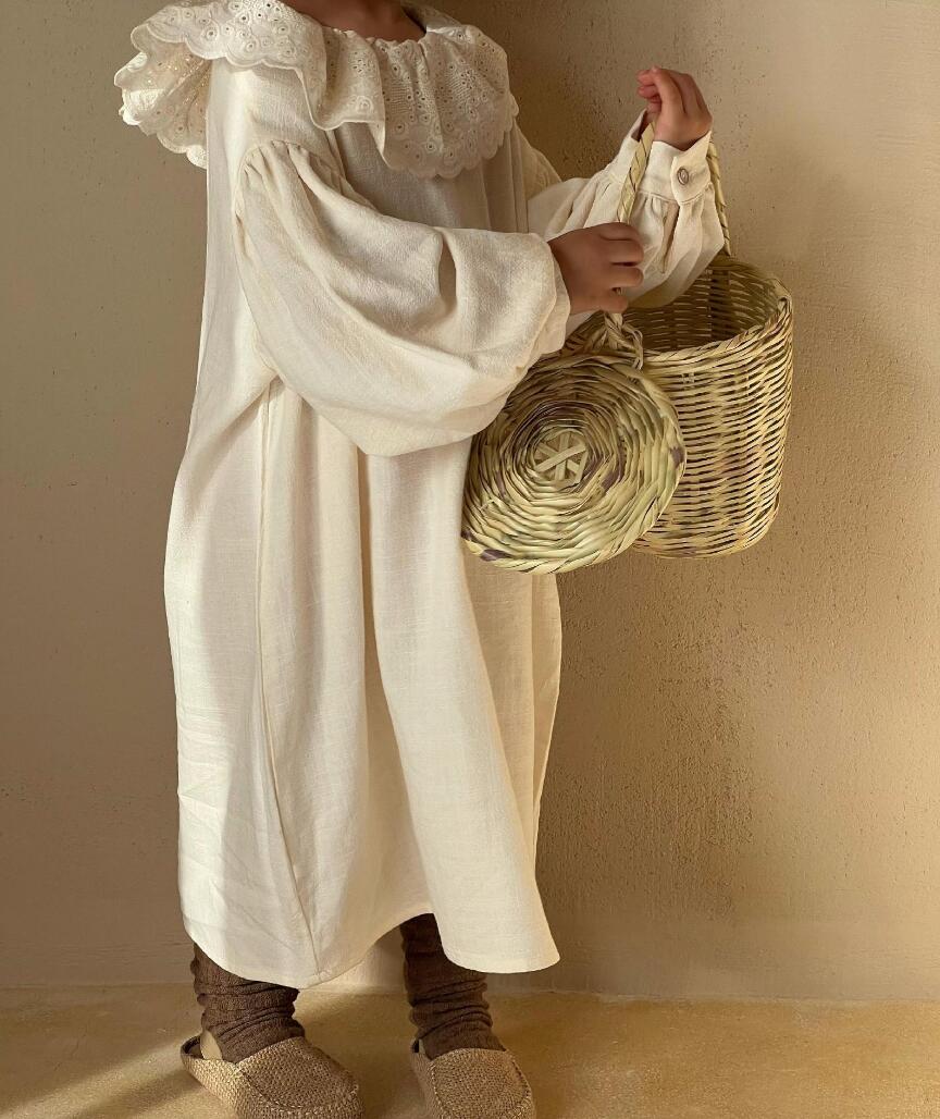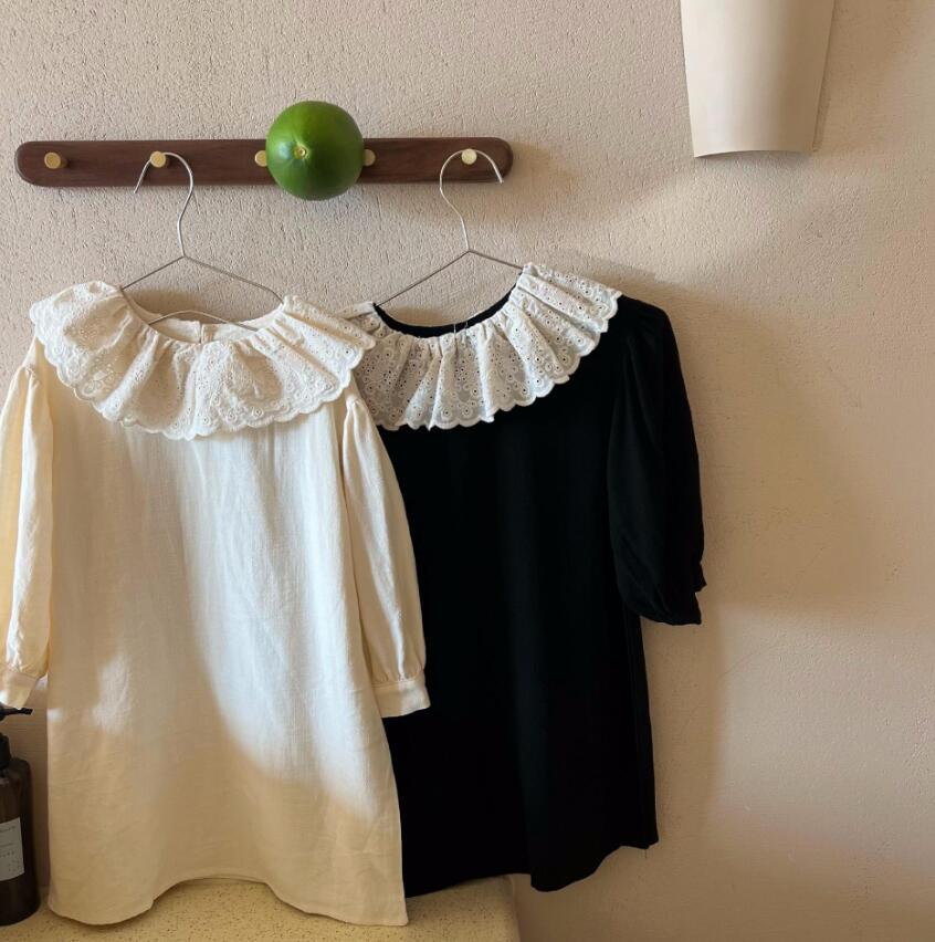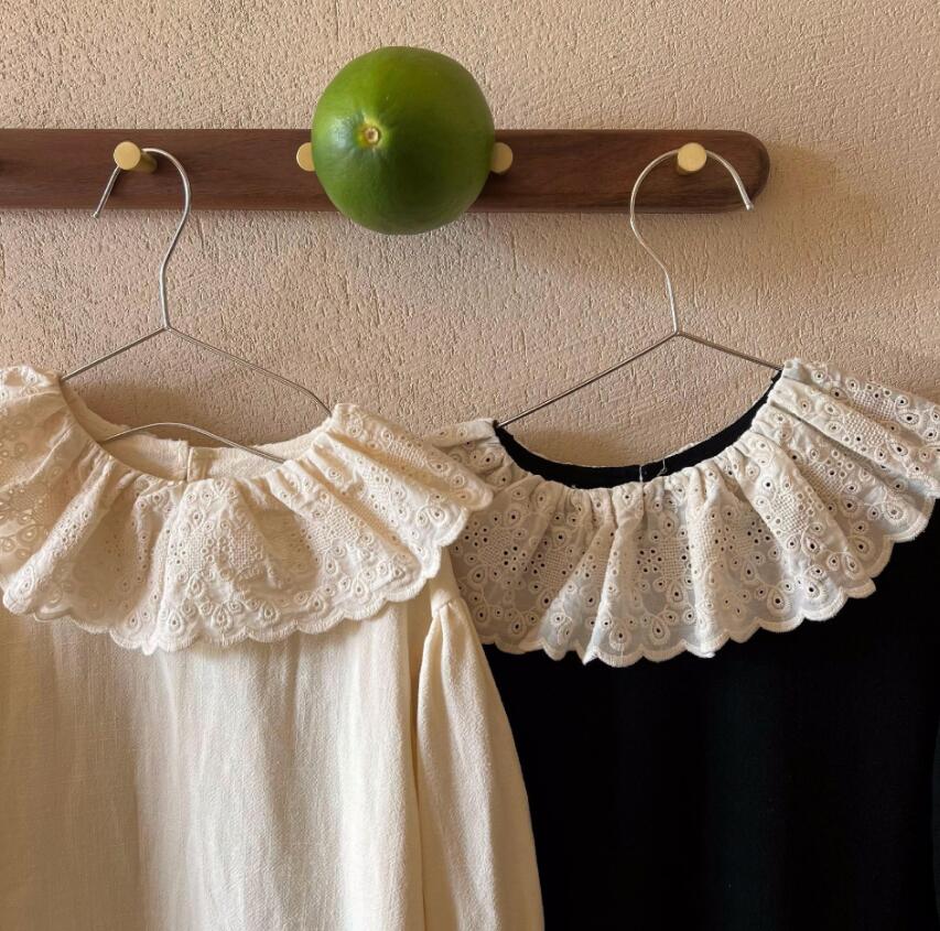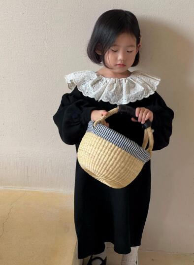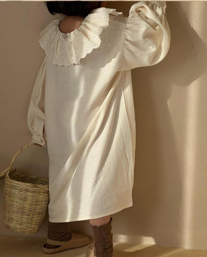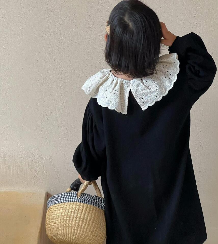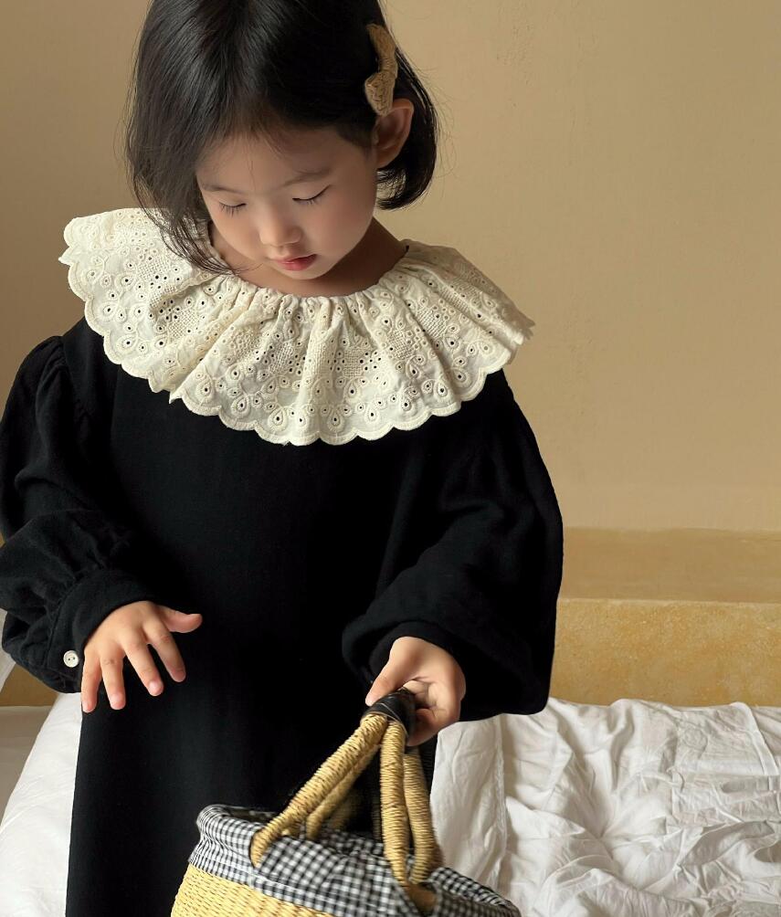 上品な刺繍レース襟が特徴的なキッズ用ロングワンピースです。 長袖タイプで秋冬シーズンにぴったり。白と黒の2色展開でお好みに合わせて選べます。 80センチから140センチまでサイズ豊富で、特別な日のお出かけや普段使いにも最適な一着です。