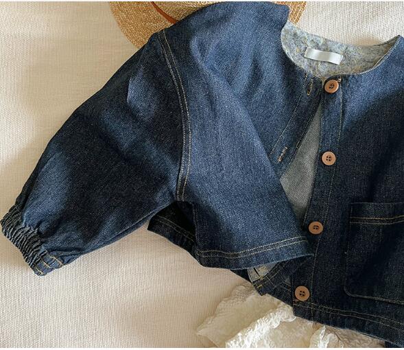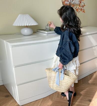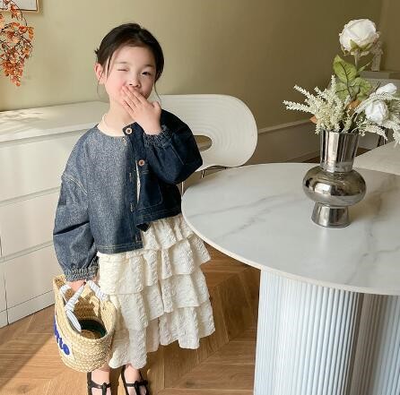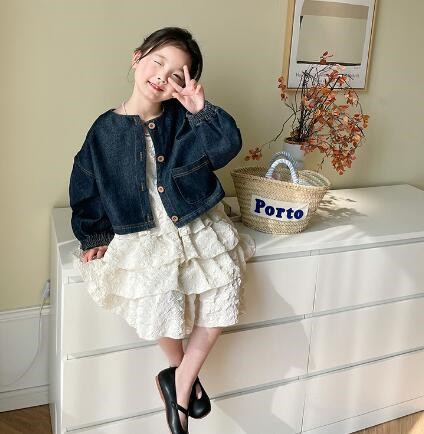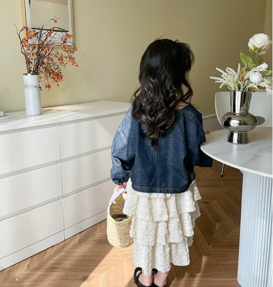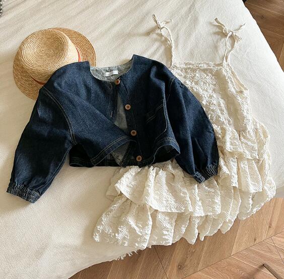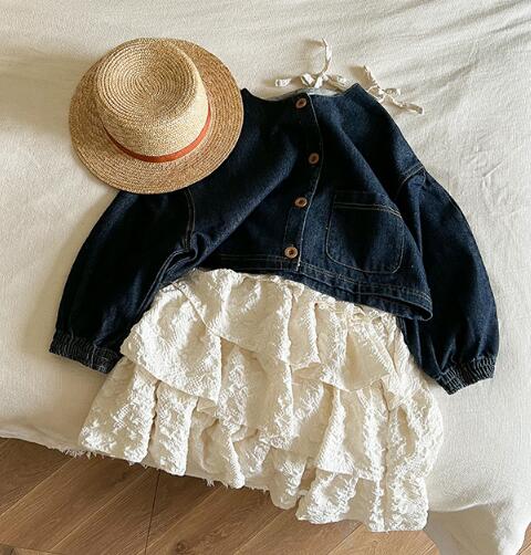 デニム素材の羽織り物と、白いレース素材を重ねたロングワンピースの組み合わせで、お洒落な着こなしが楽しめます。