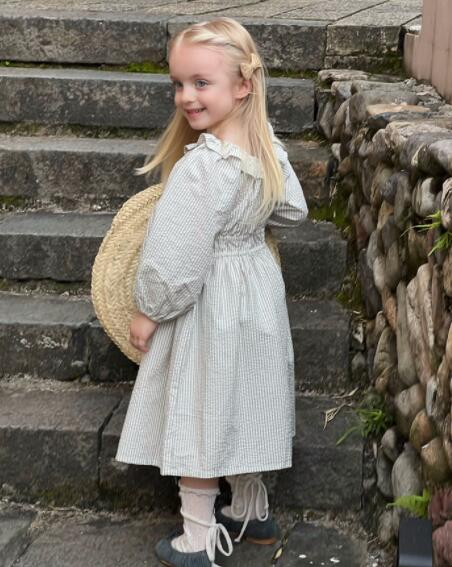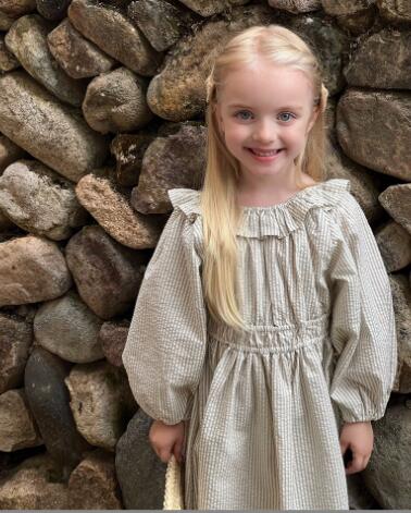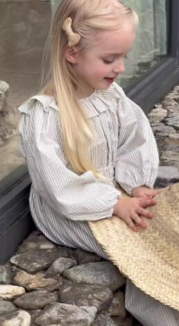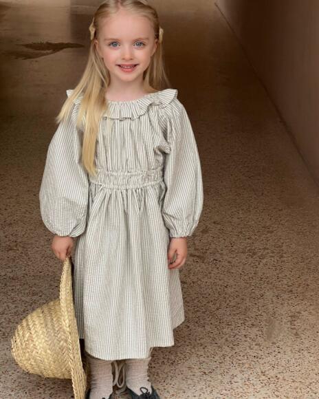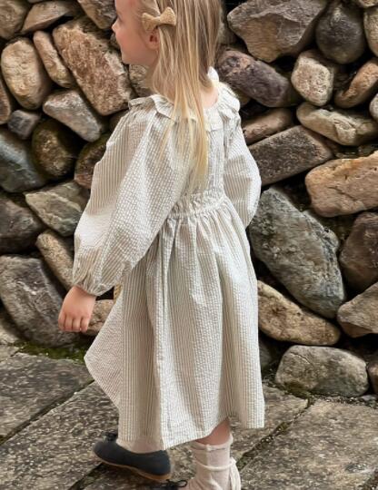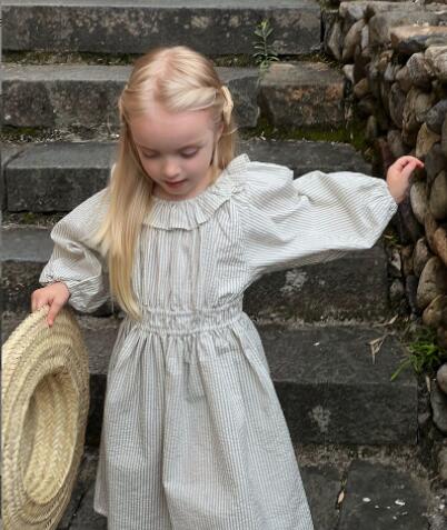 上品な縦縞柄が魅力的なキッズ用ロングワンピースです。 可愛らしい襟付きデザインで長袖仕様、お出かけにもぴったり。 90センチから150センチまで豊富なサイズ展開で長くご愛用いただけます。 柔らかな生地で着心地も抜群の一枚です。