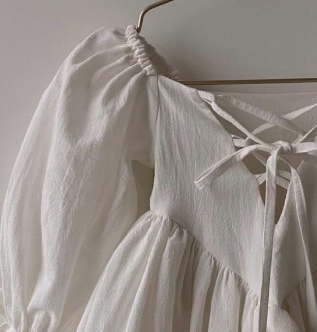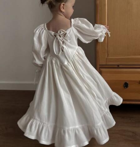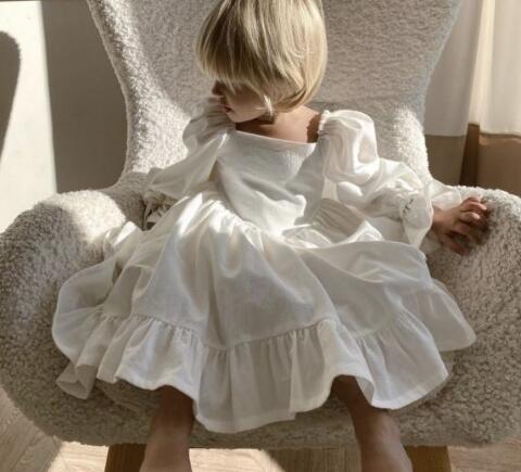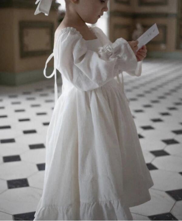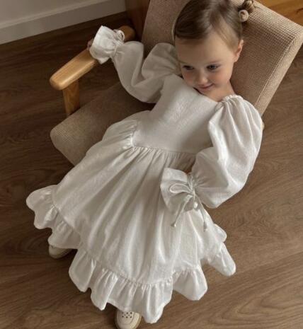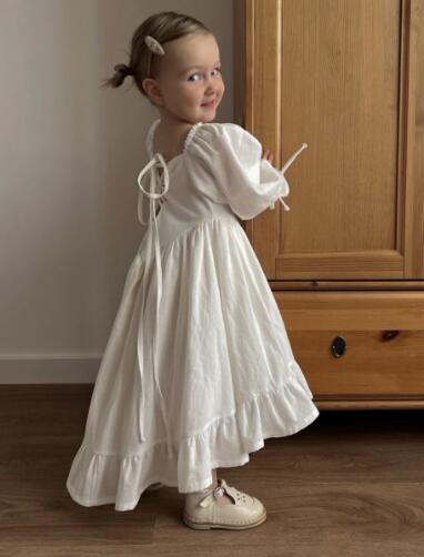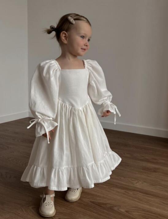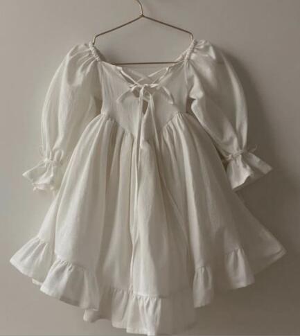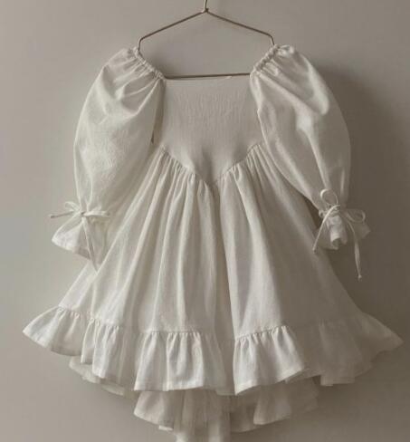 可愛らしいパフ袖と袖口のリボンが特徴的で、フリルの裾が女の子らしさを演出します。