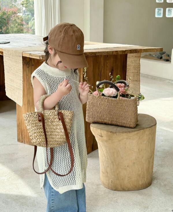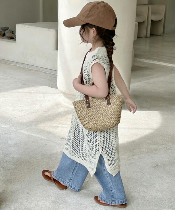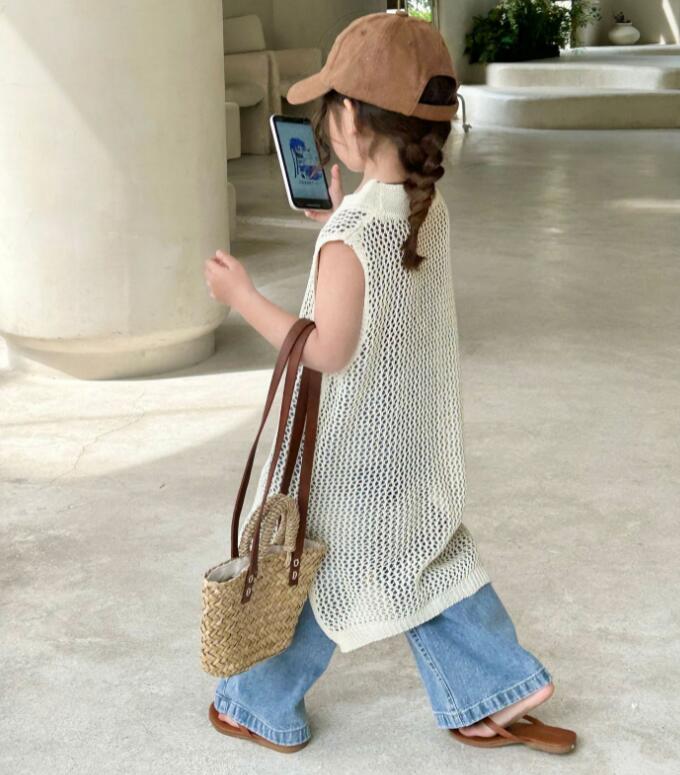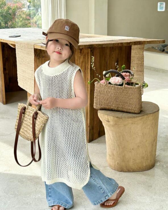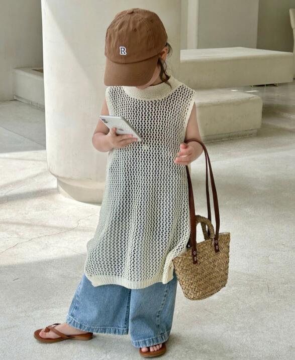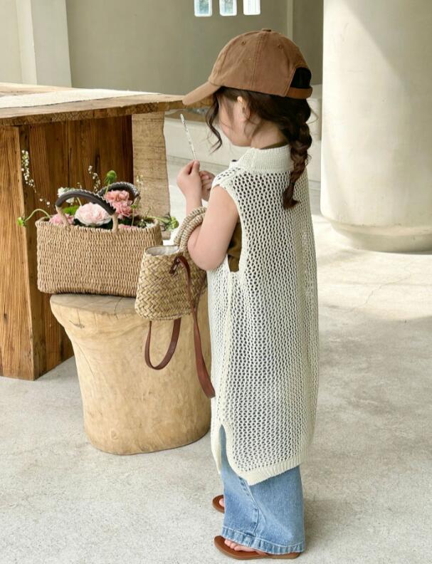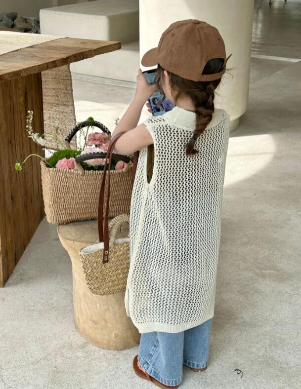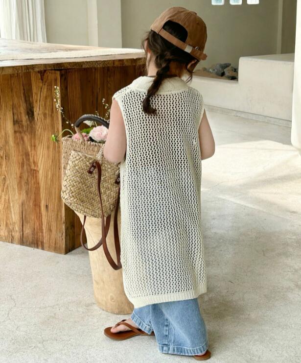 キッズ用の涼しげな編み模様が可愛いロングベストです。