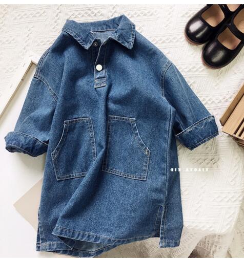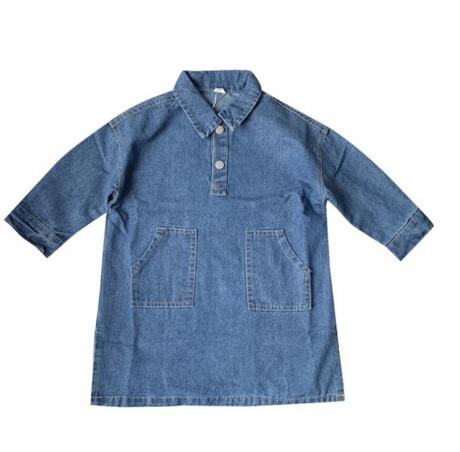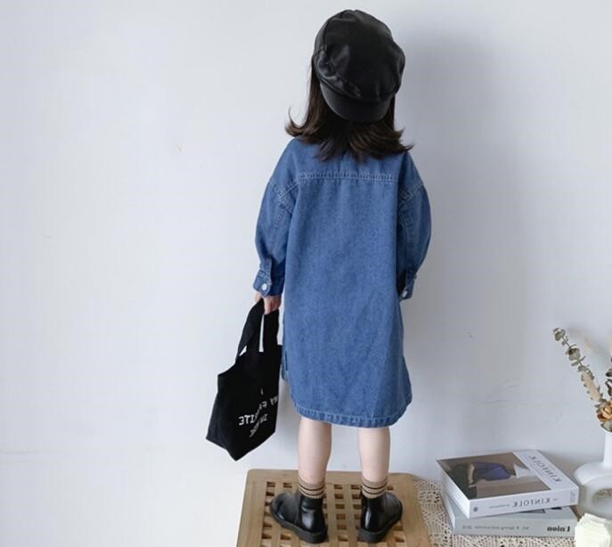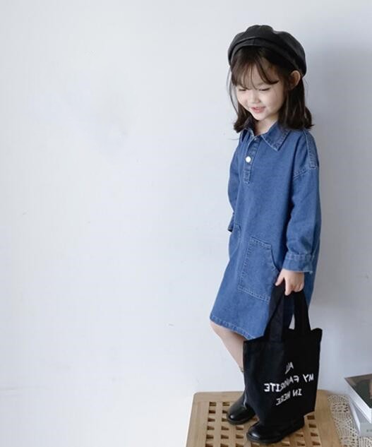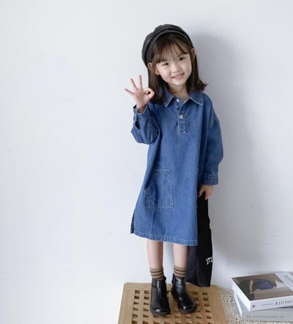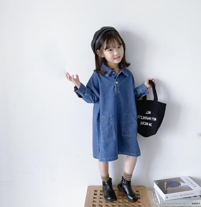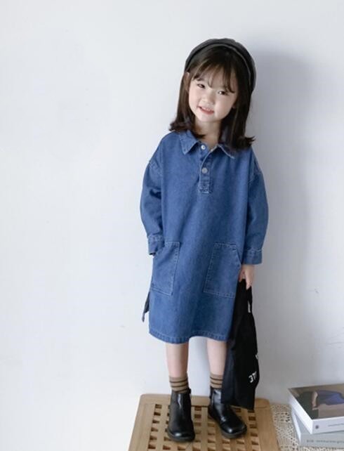 おしゃれなキッズ向けデニム素材のロングワンピースです。 復古調のデザインで襟付き長袖タイプ、前ポケット付きの機能的なデザイン。 90センチから140センチまで幅広いサイズ展開で、 普段着からお出かけまで様々なシーンでご活用いただけます。