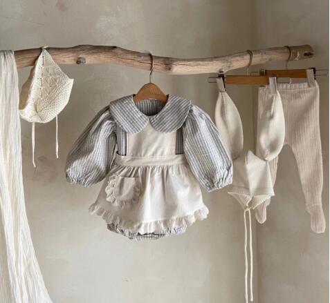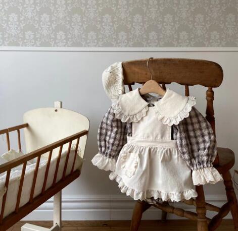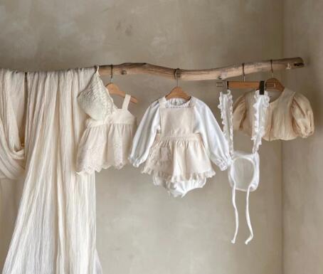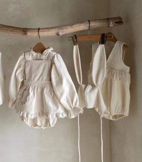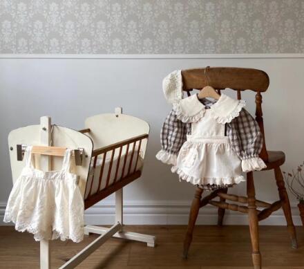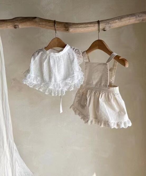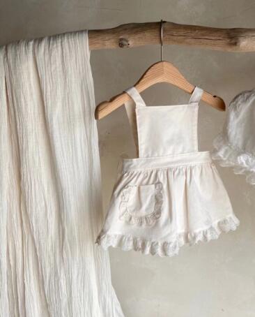 可愛らしいキッズ用の白色前掛け風ワンピースです。