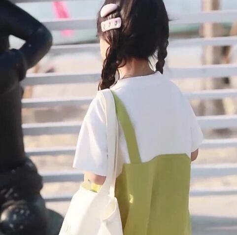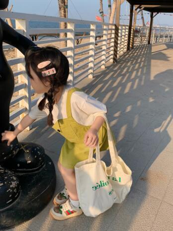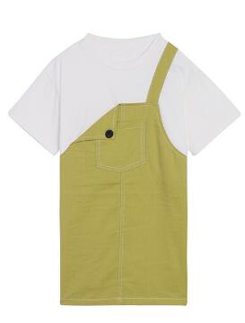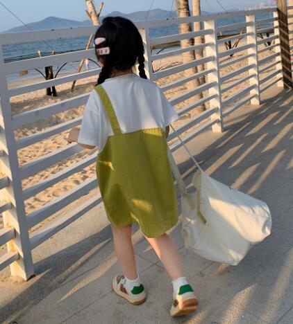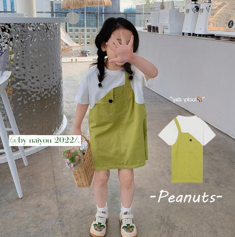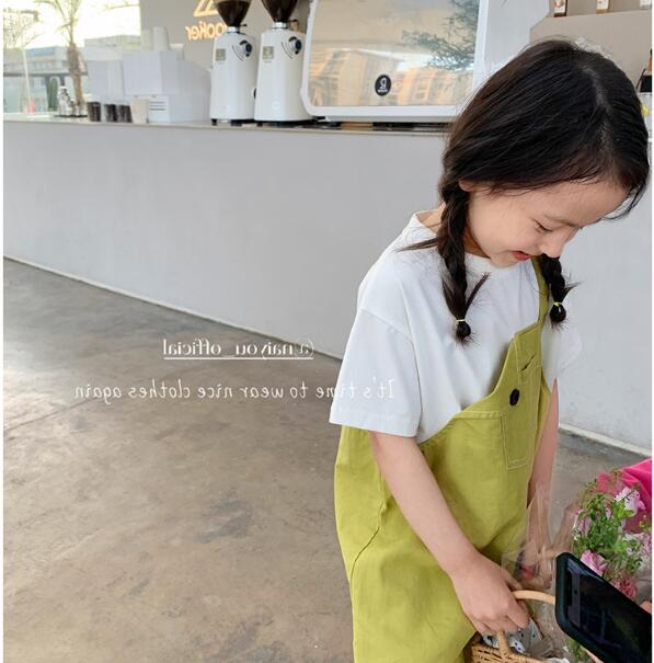 白いトップスと爽やかなグリーンのジャンパースカートが