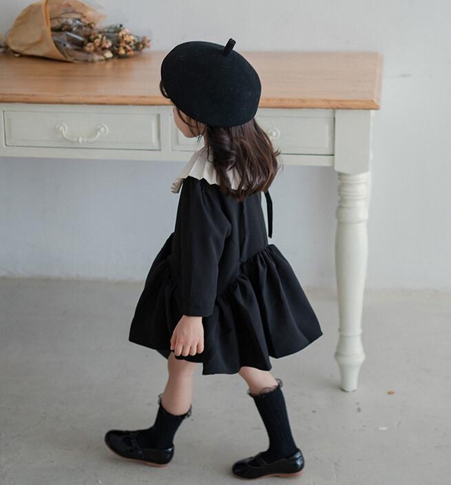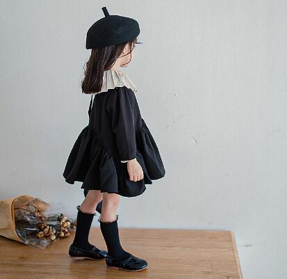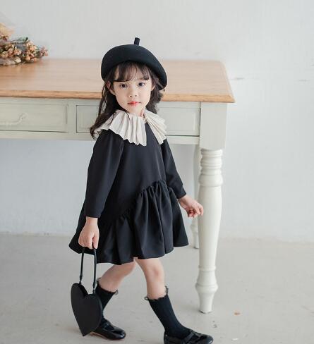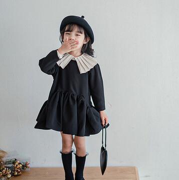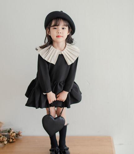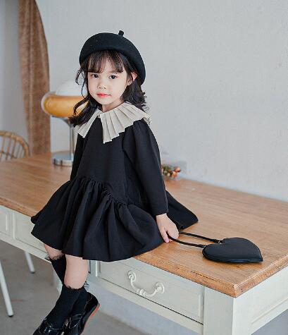 上品な白い襟がアクセントの黒いキッズ用ロングワンピース。 長袖でティアードスカートが可愛らしく、90センチから140センチまで対応。 フォーマルシーンにもカジュアルにも着回せる万能アイテムです。