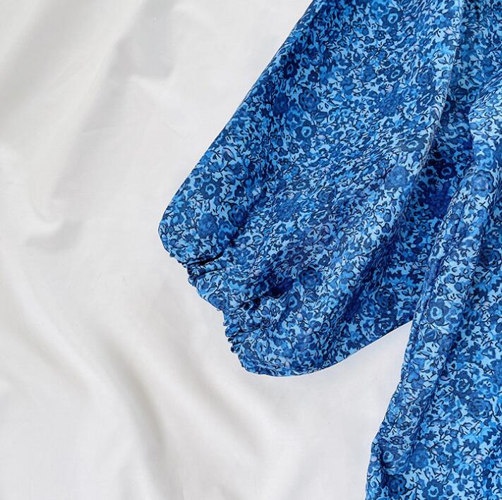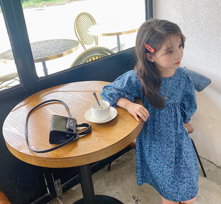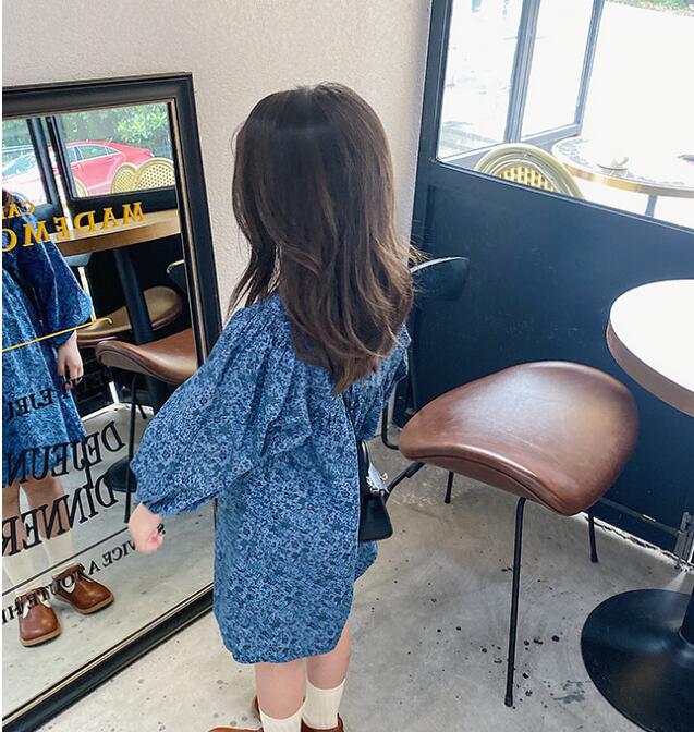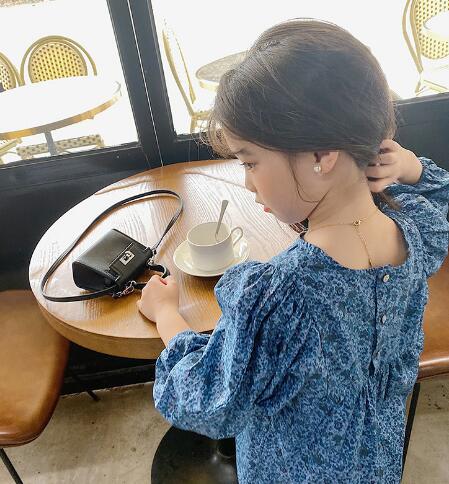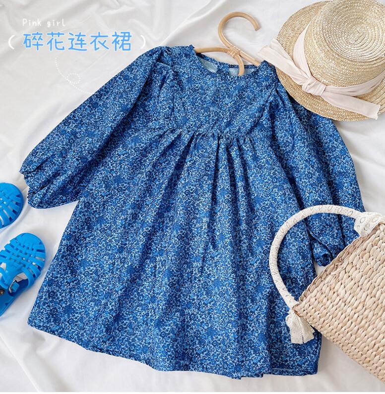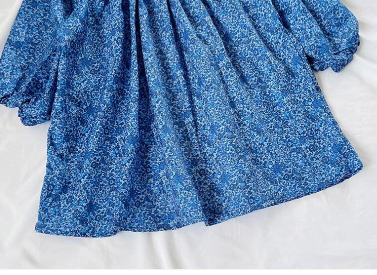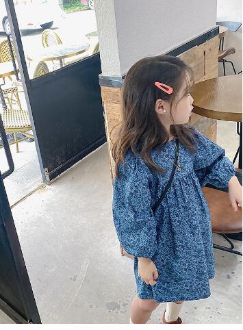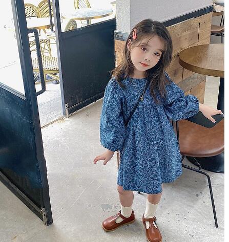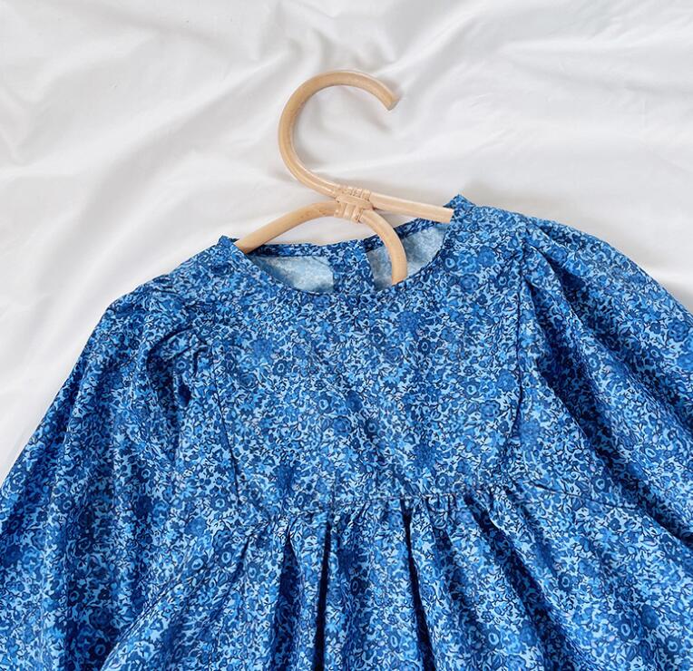 上品な青色の小花柄が可愛らしいキッズ用ロングワンピースです。