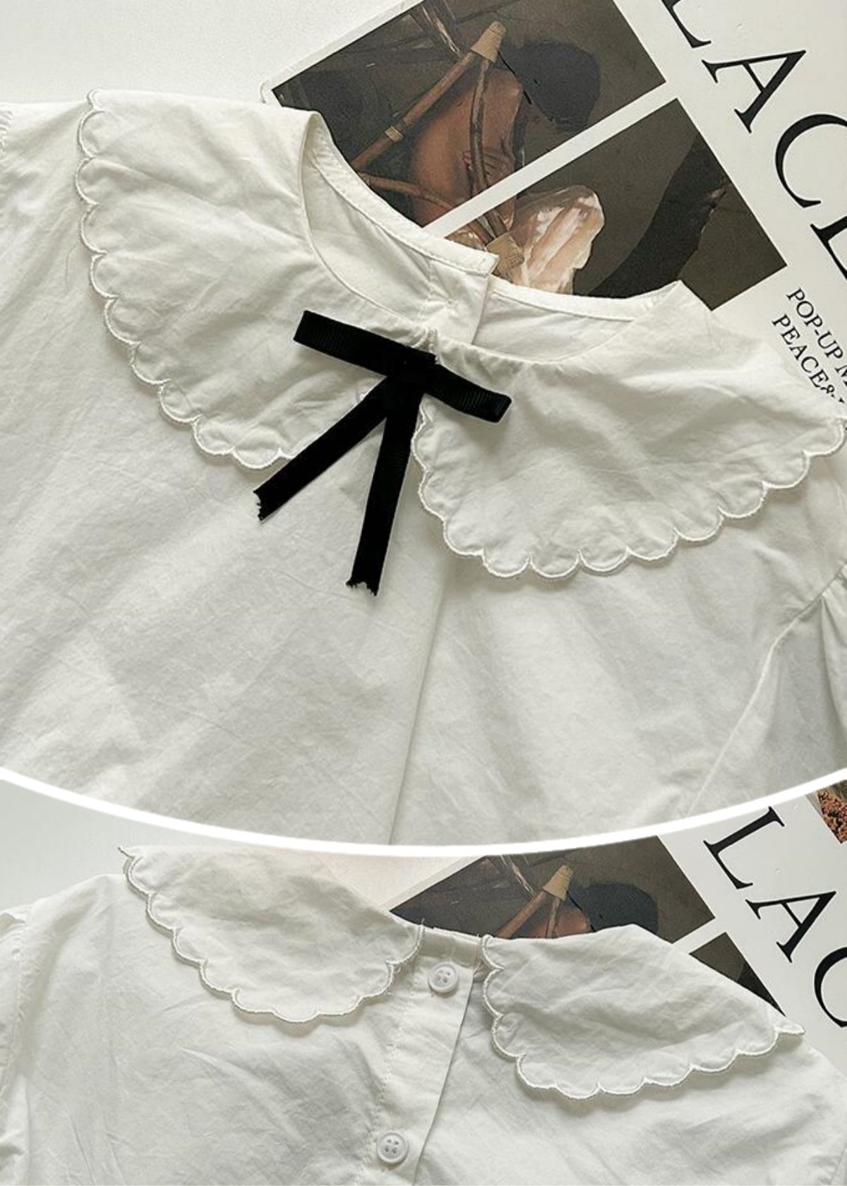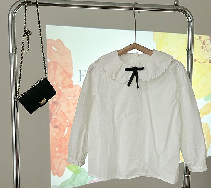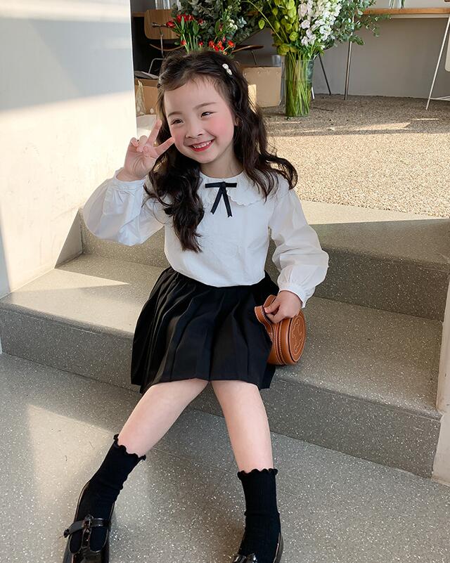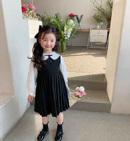 白い長袖シャツと紺色のジャンパースカートの組み合わせで、