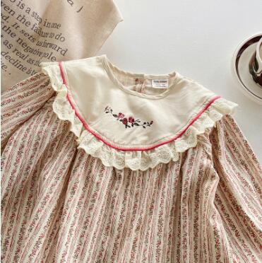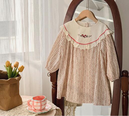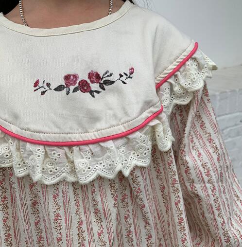 胸元の可愛い花柄刺繍とフリル襟がポイントの上品なデザイン。