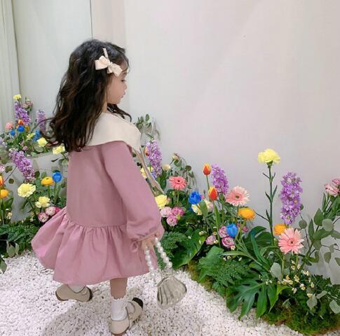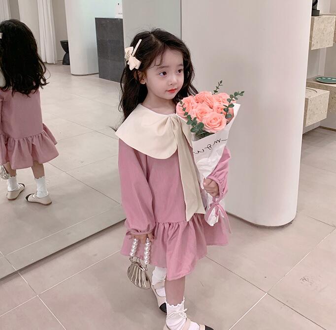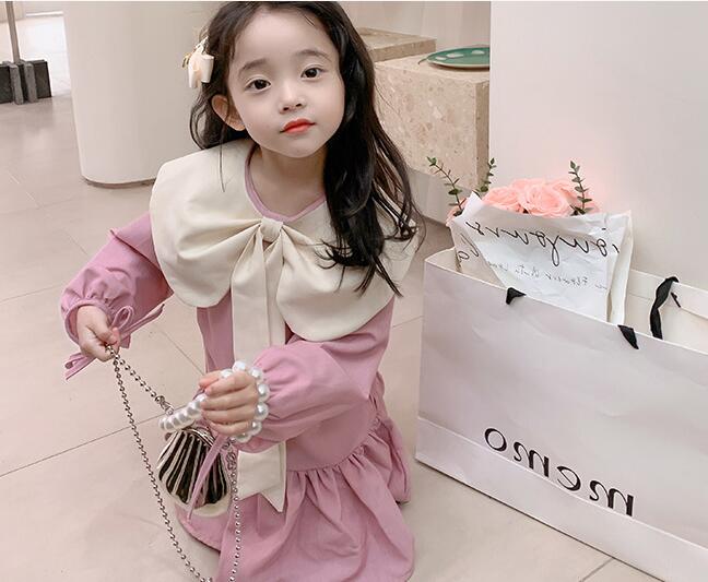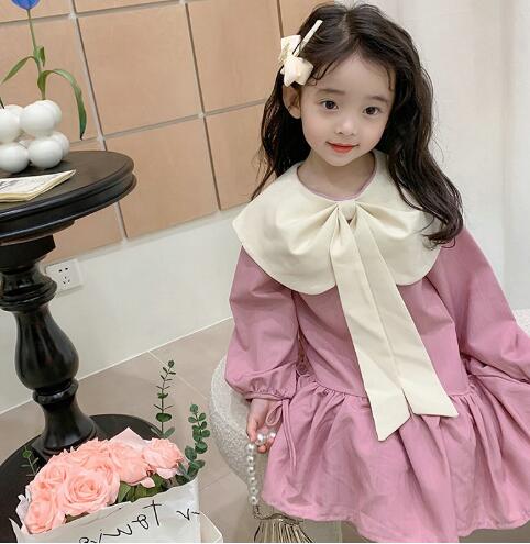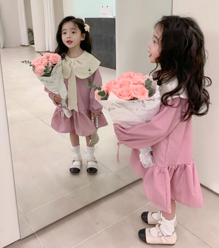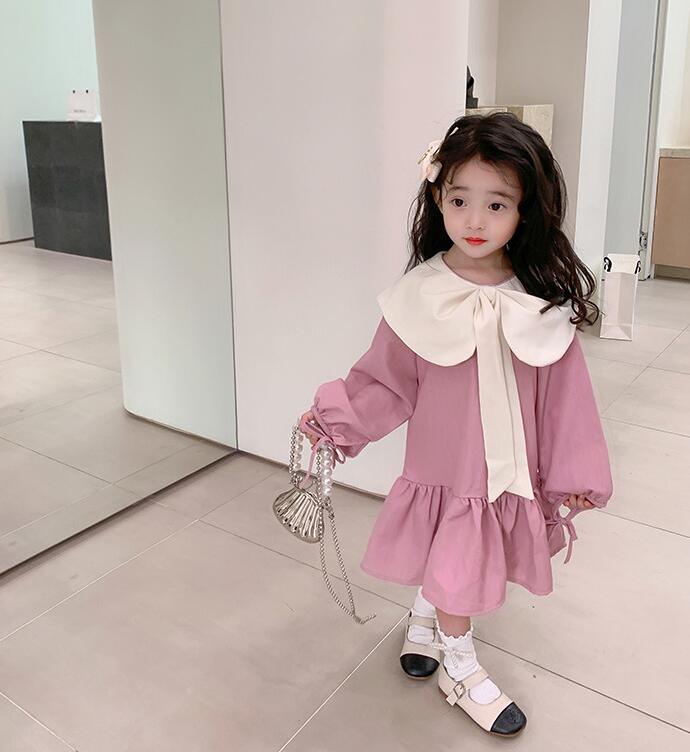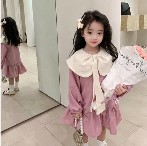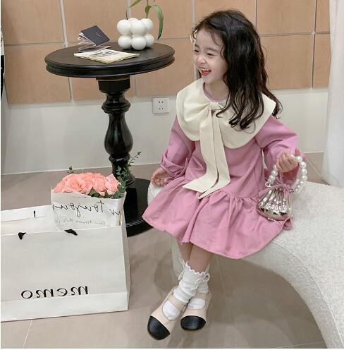 上品な大きな白襟とリボンが特徴的なキッズ向けロングワンピースです。