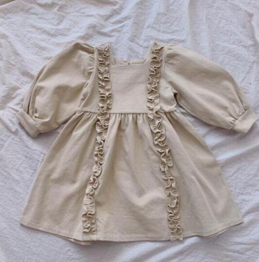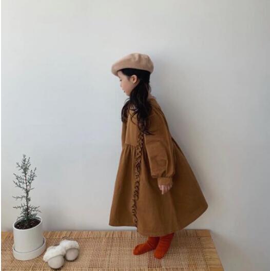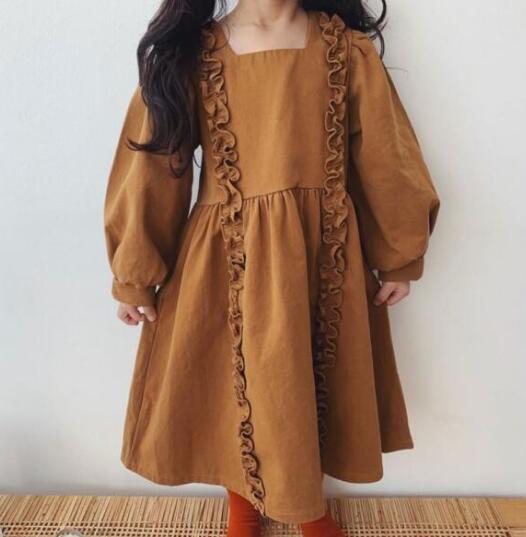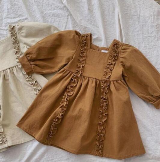 上品なキャメル色とナチュラルな白色の2色展開で、胸元と袖口の繊細なフリル装飾が可愛らしさを演出します。