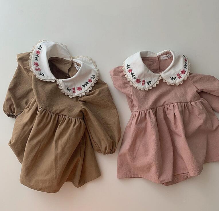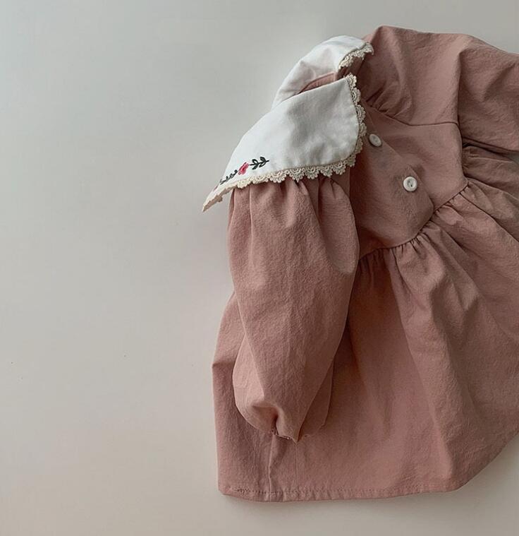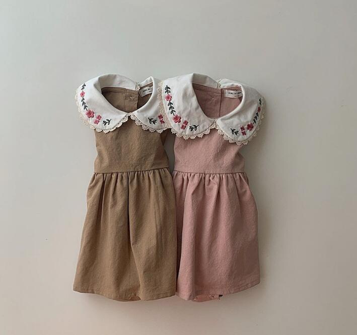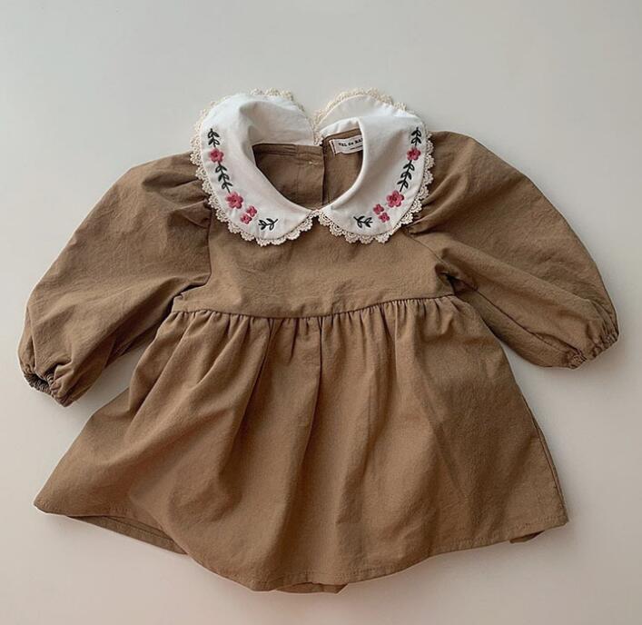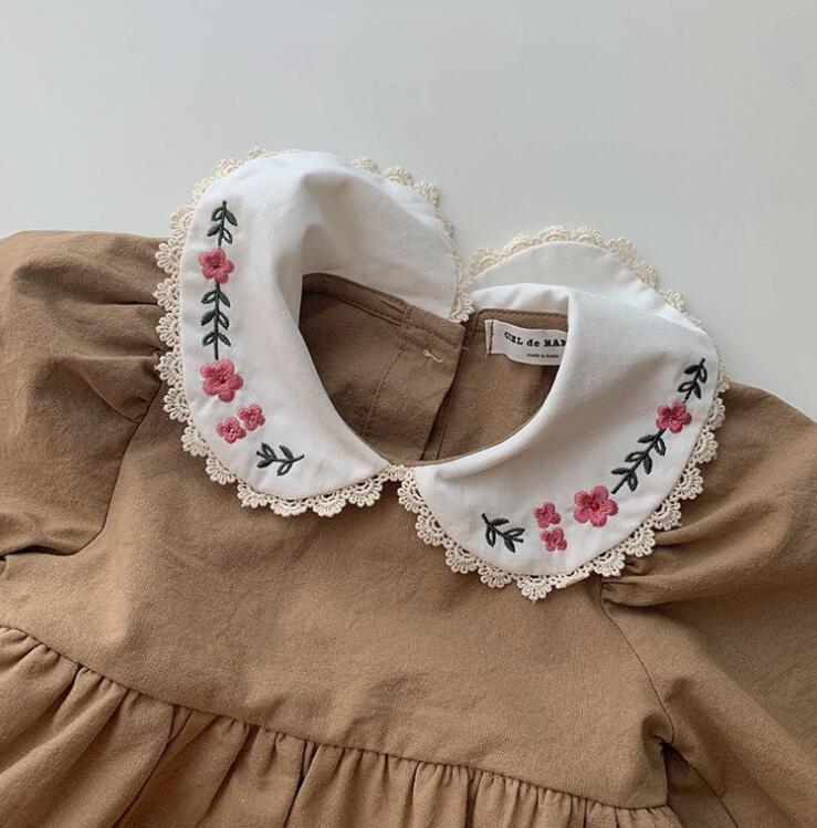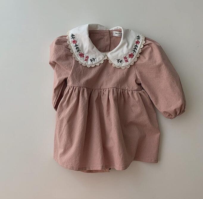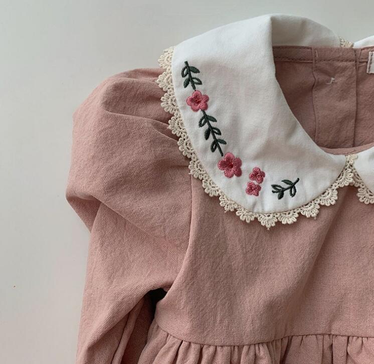 可愛らしい花柄刺繍の丸襟が特徴的なキッズ用ロンパース型ワンピースです。