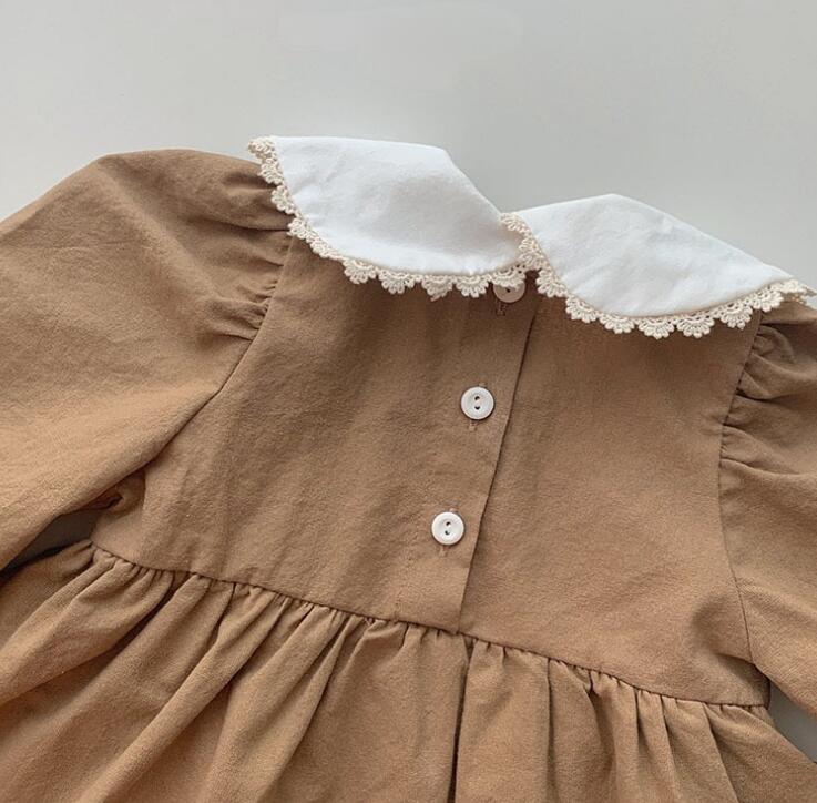 可愛らしい花柄刺繍の丸襟が特徴的なキッズ用ロンパース型ワンピースです。 ふんわりとしたパフスリーブとギャザースカートがロングワンピースのような上品な仕上がりを演出します。 着脱しやすいロンパース仕様で動きやすく、お出かけから普段着まで幅広く活用できる一着です。