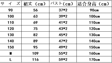 キッズサイズは九十から百五十センチ、大人サイズはエムエルをご用意。