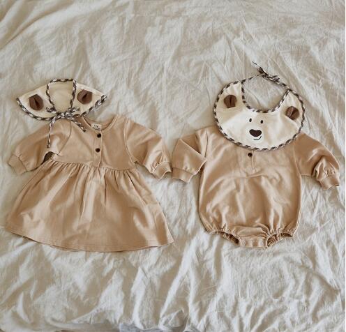 可愛いロングワンピース風ロンパースとお揃いのよだれかけをセットでお届けします。