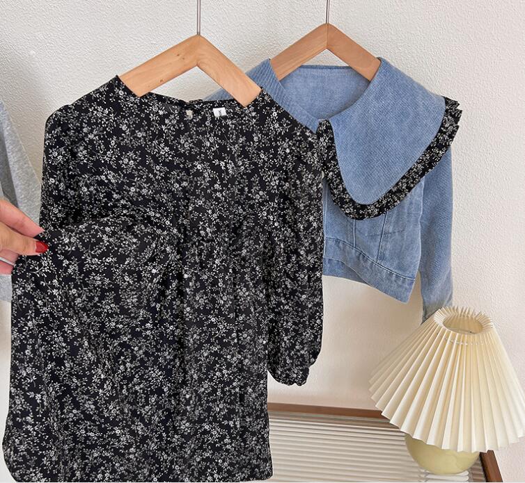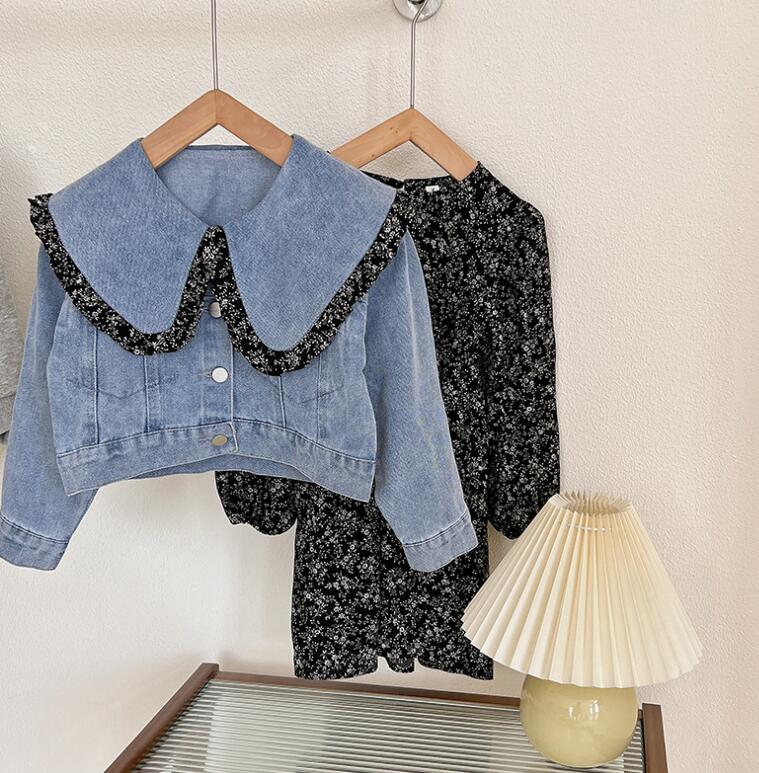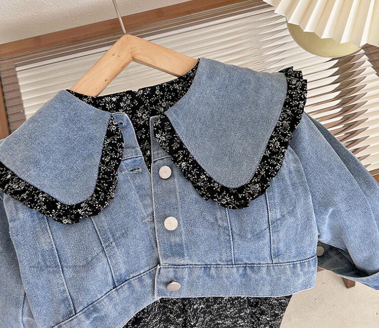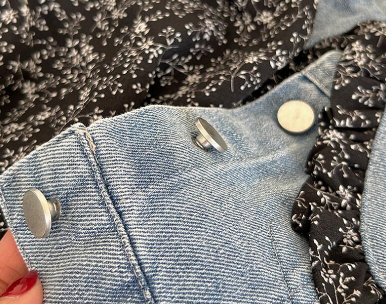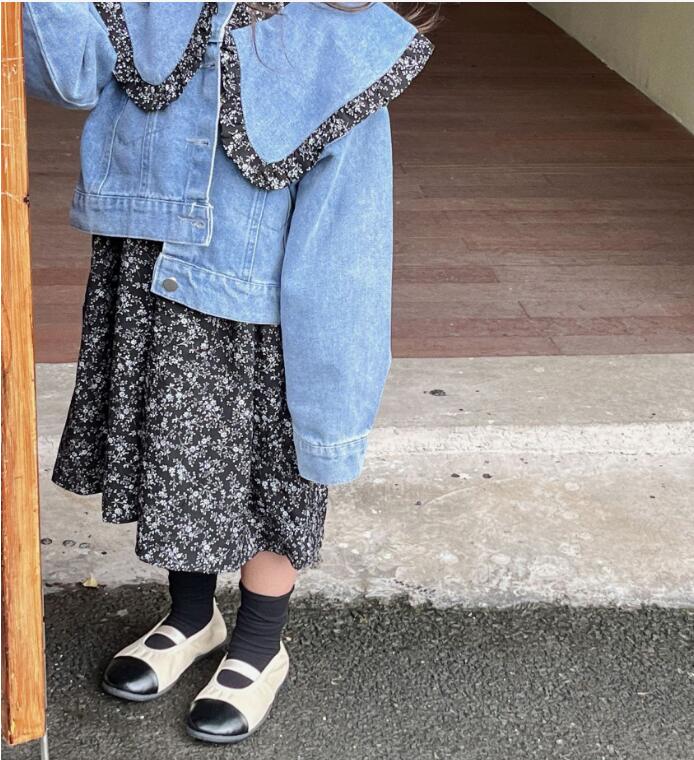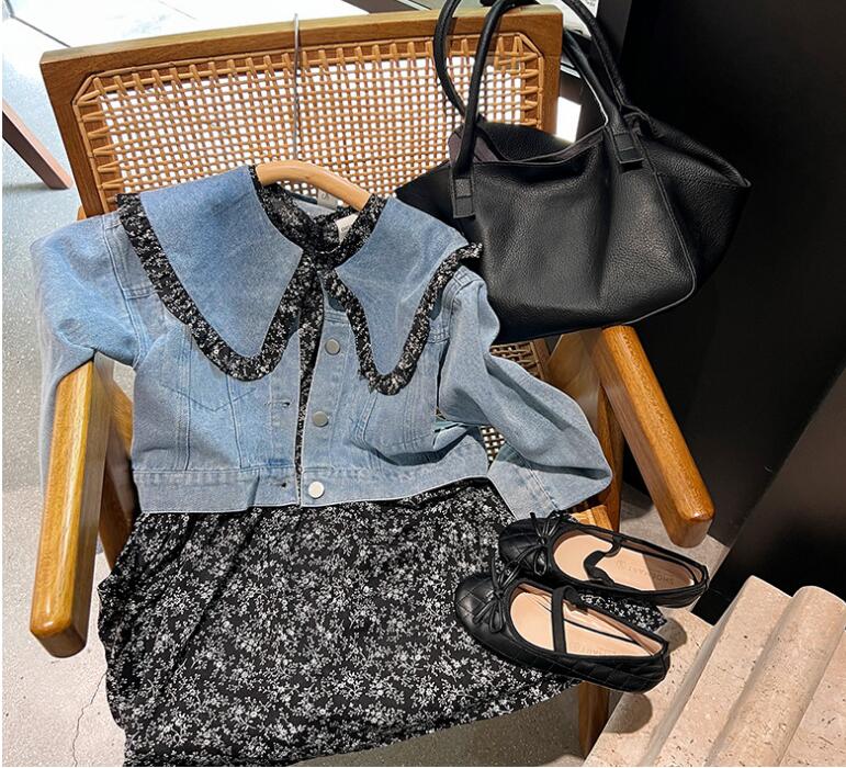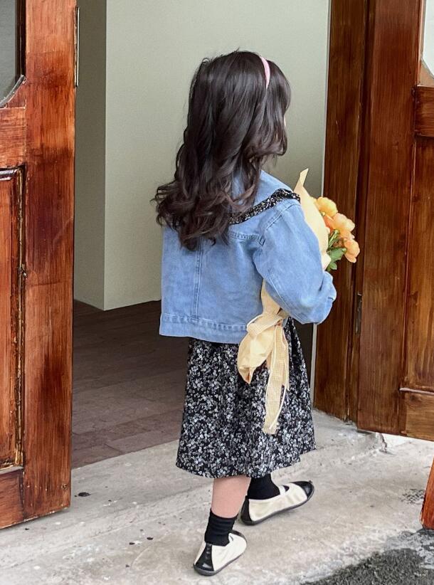 上品な花柄のロングワンピースと爽やかなデニムジャケットの組み合わせで、