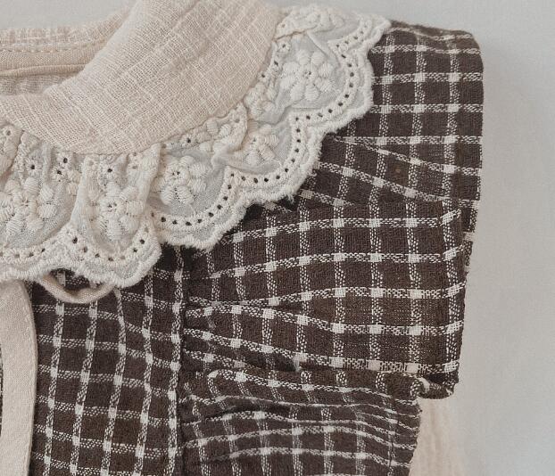 白い長袖ブラウスとチェック柄のジャンパースカートがセットになっており、重ね着風の上品な仕上がりに。