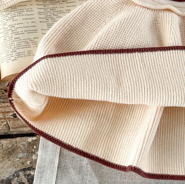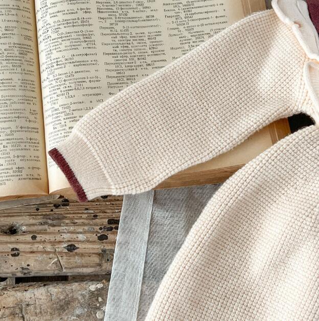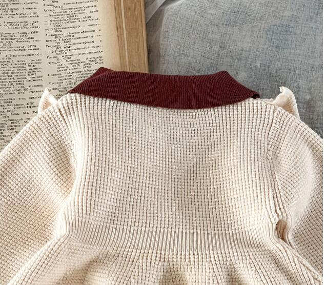 落ち着いたベージュカラーにエンジの襟とパイピングがアクセント。
