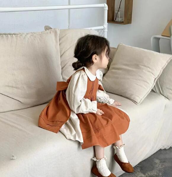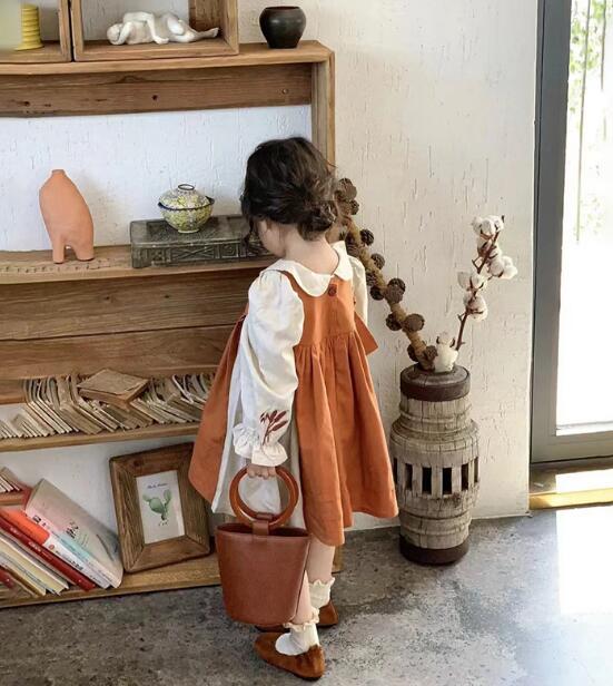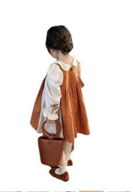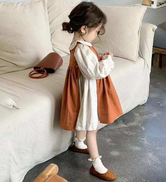 白のブラウス風トップスにテラコッタカラーのジャンパースカートを組み合わせた、上品で優しい印象の一着。
