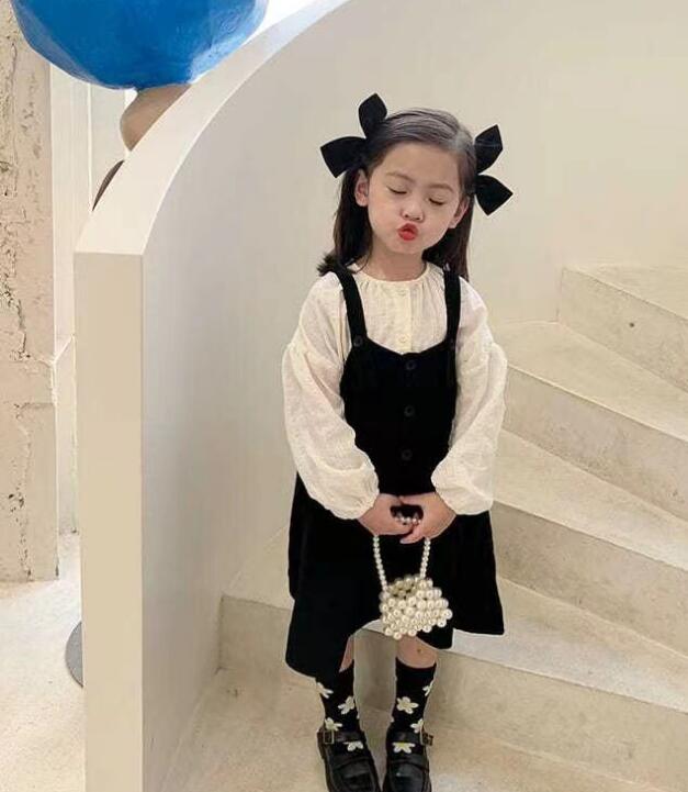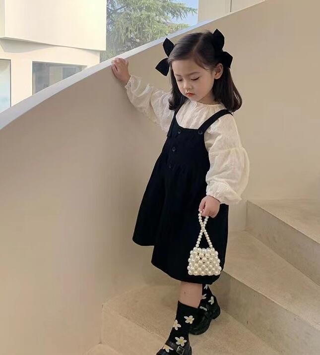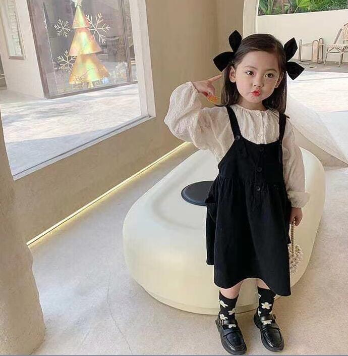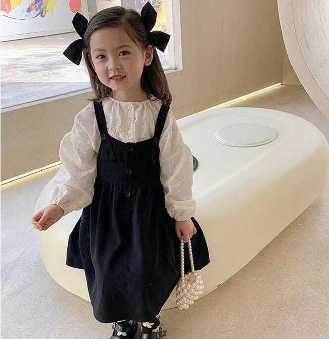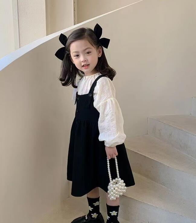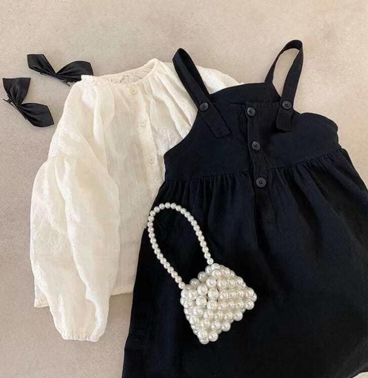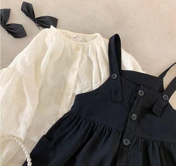 白の長袖ブラウスと黒の吊りスカートの組み合わせで上品な仕上がりに。