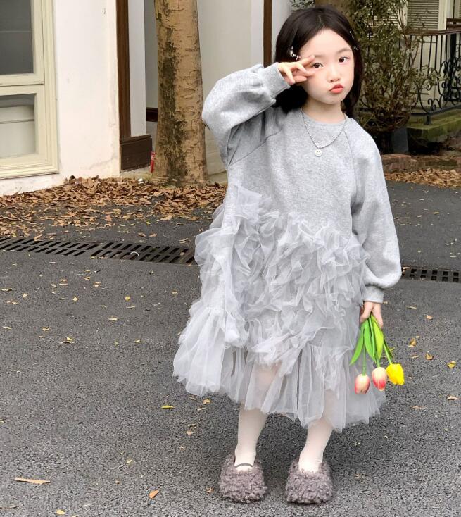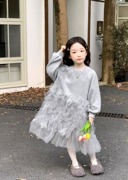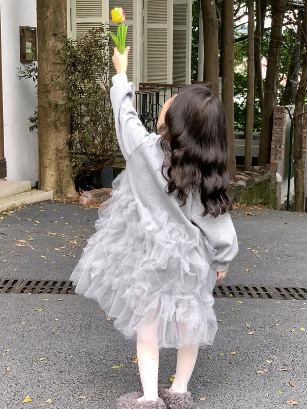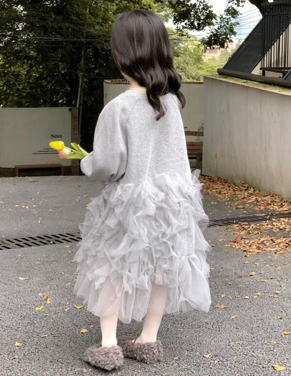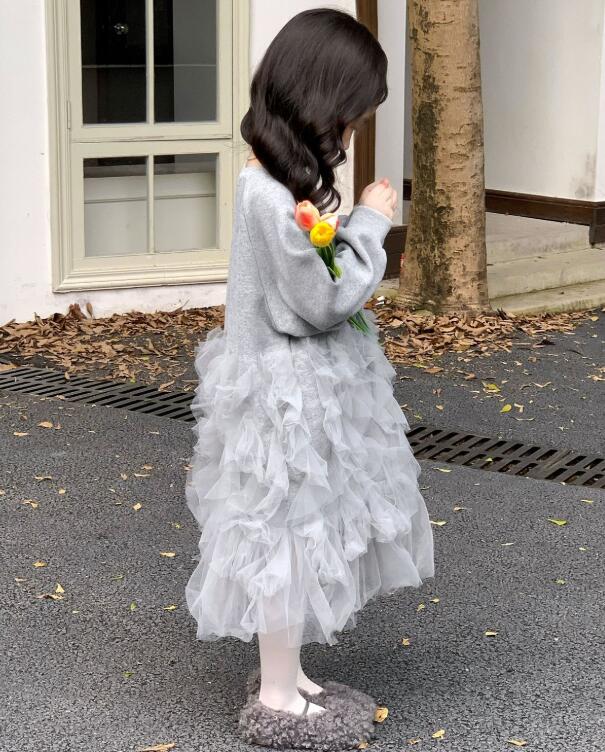 ふわふわのチュールが何層にも重なった、キッズ向けの上品なロングワンピースです。