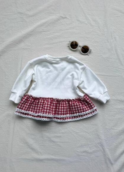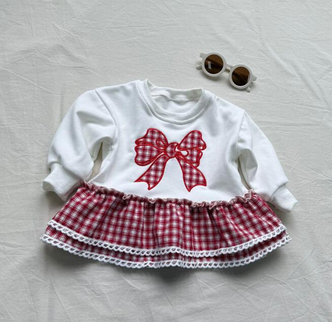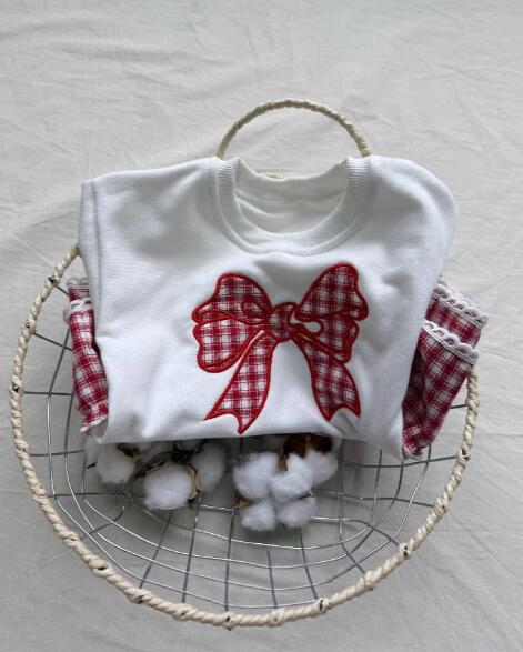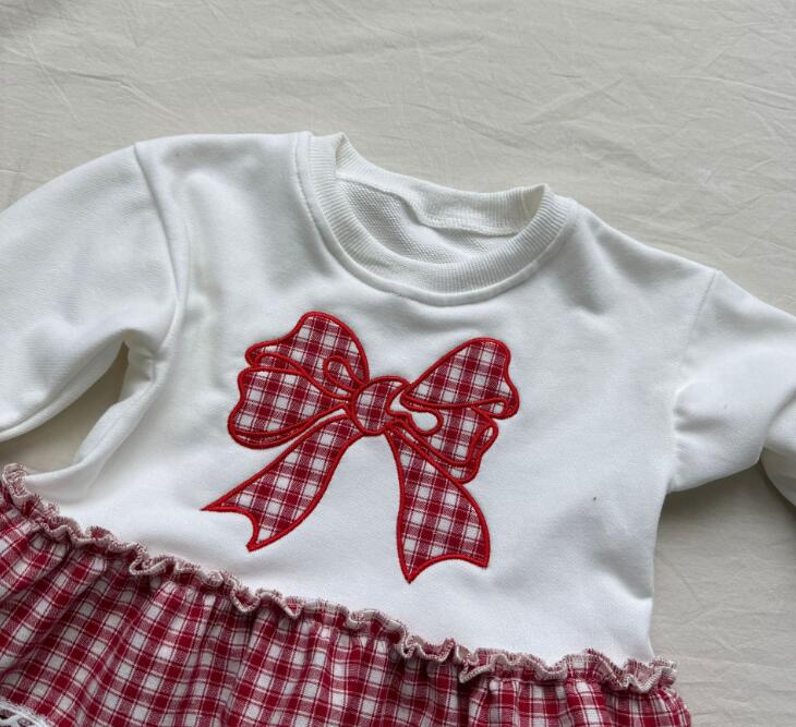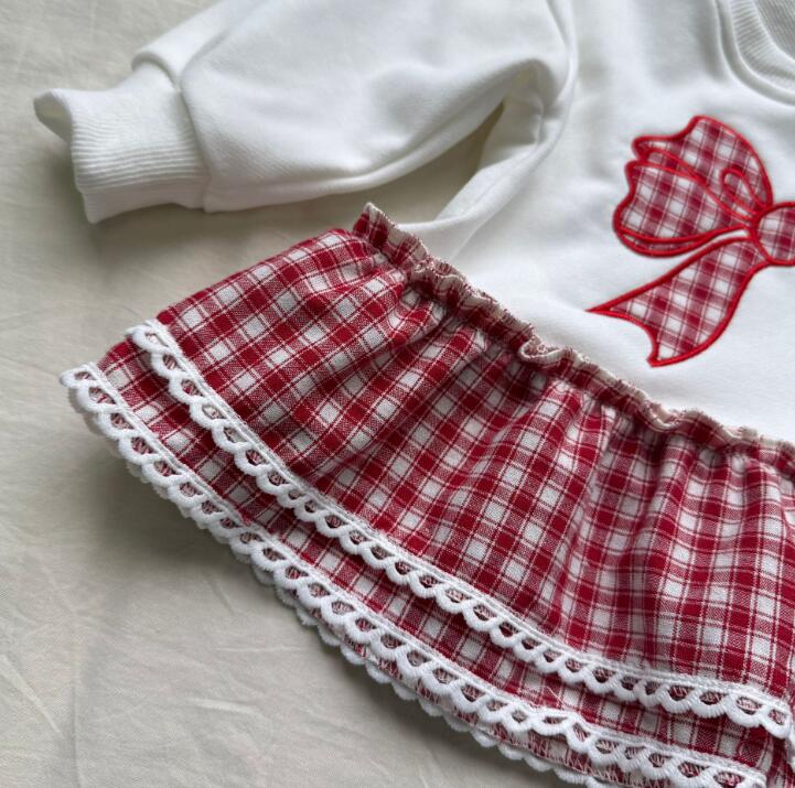 白いトップスに赤いチェック柄のリボンデザインが施され、