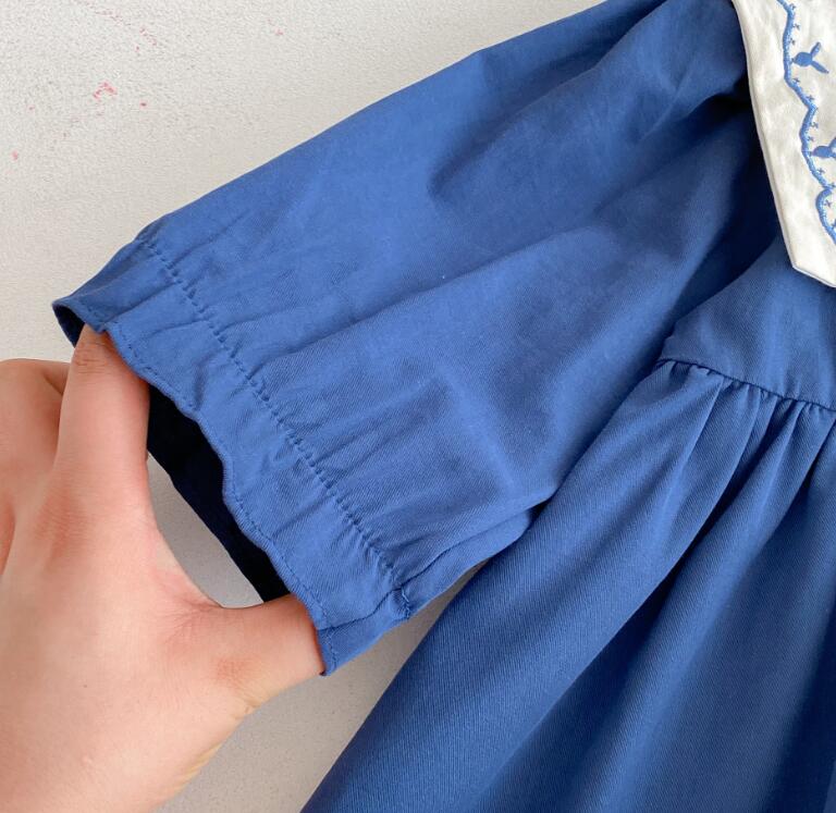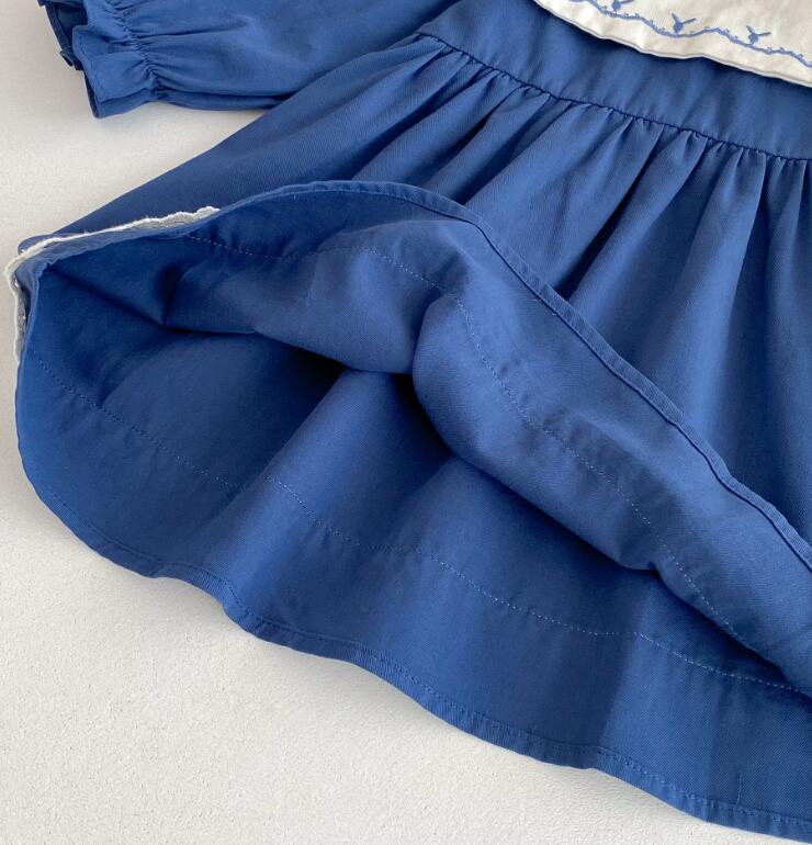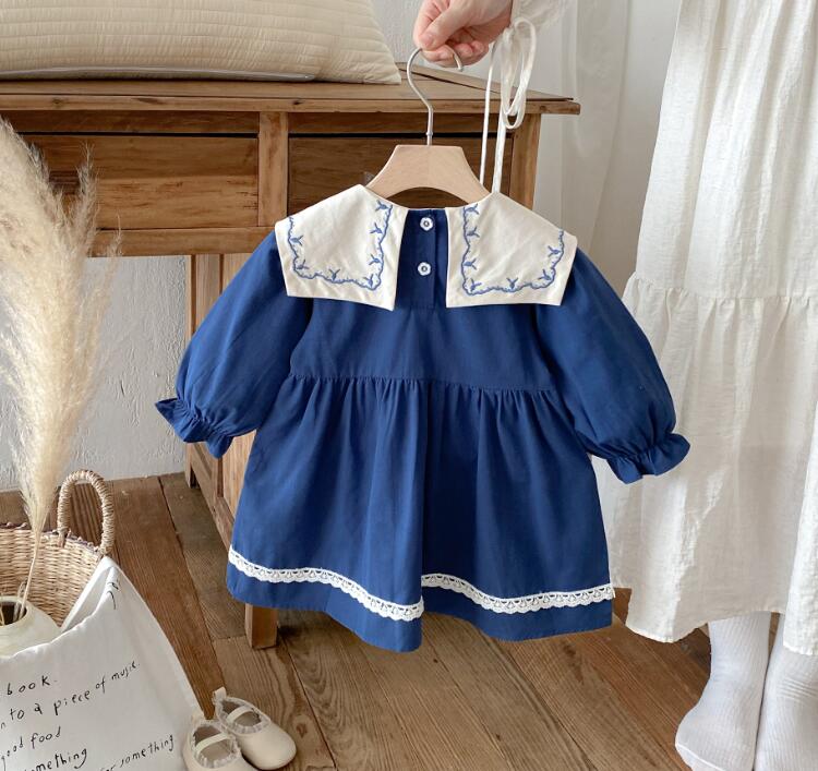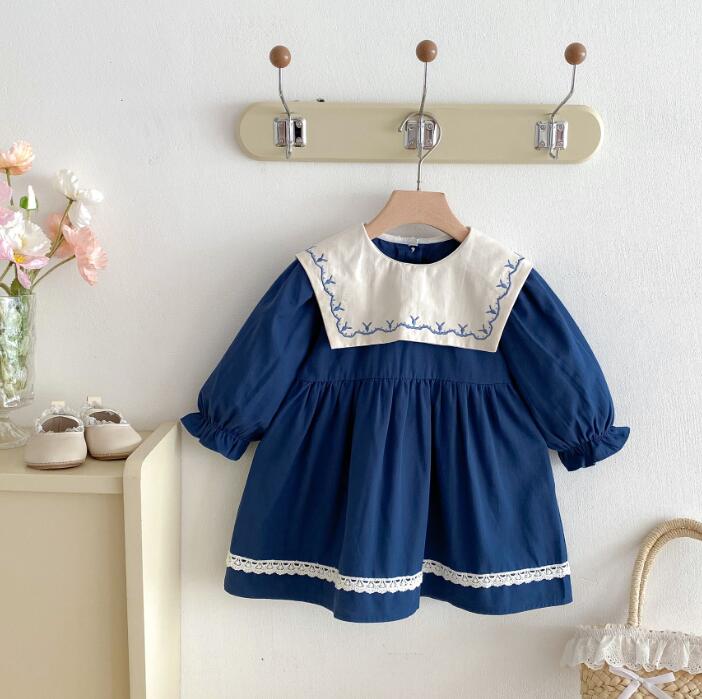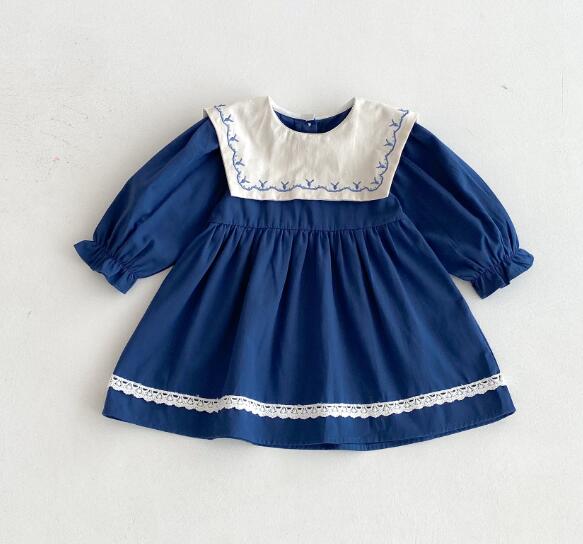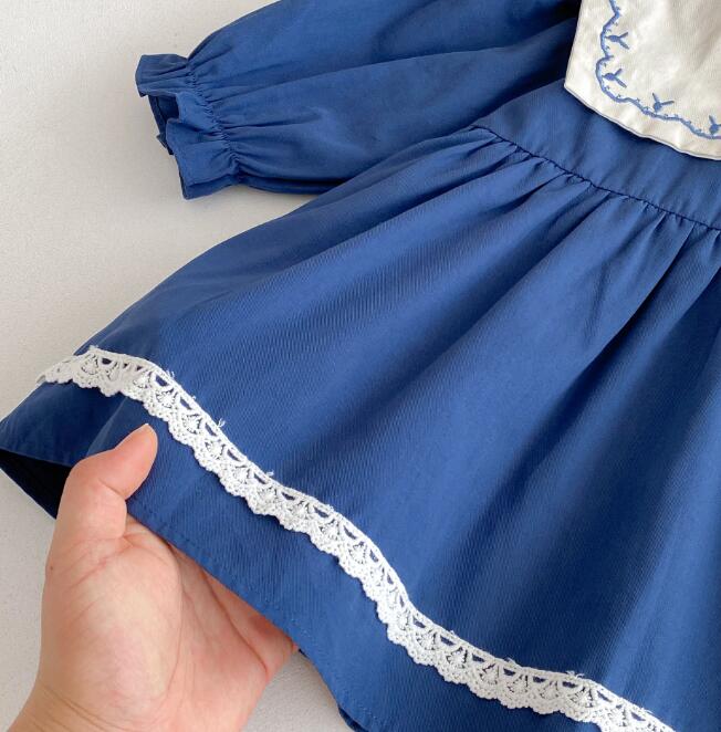 深みのあるネイビー生地に白いレース装飾が映える、お出かけにぴったりの一着です。