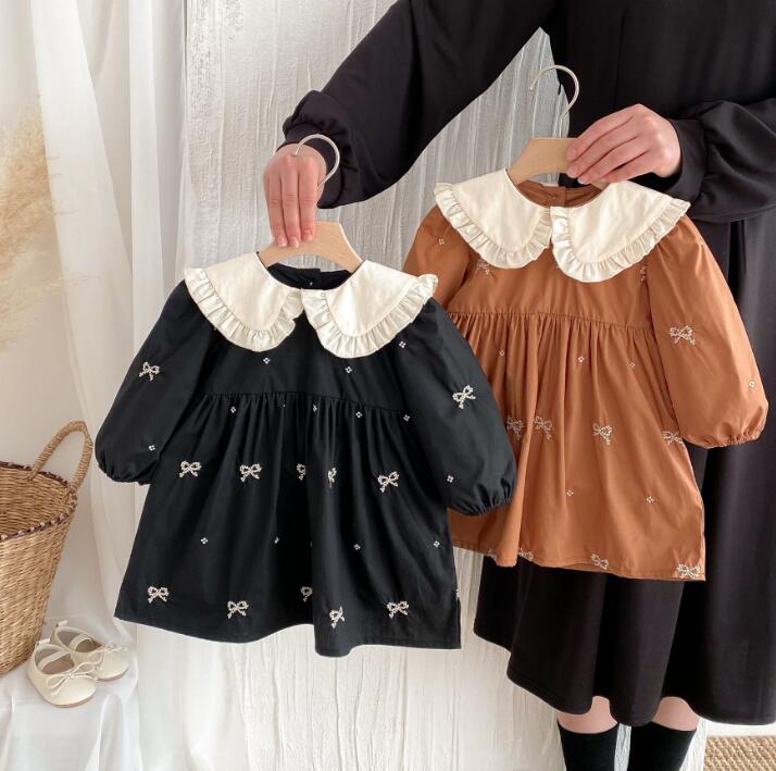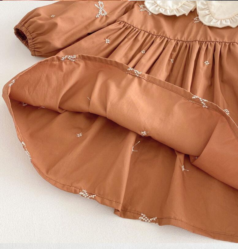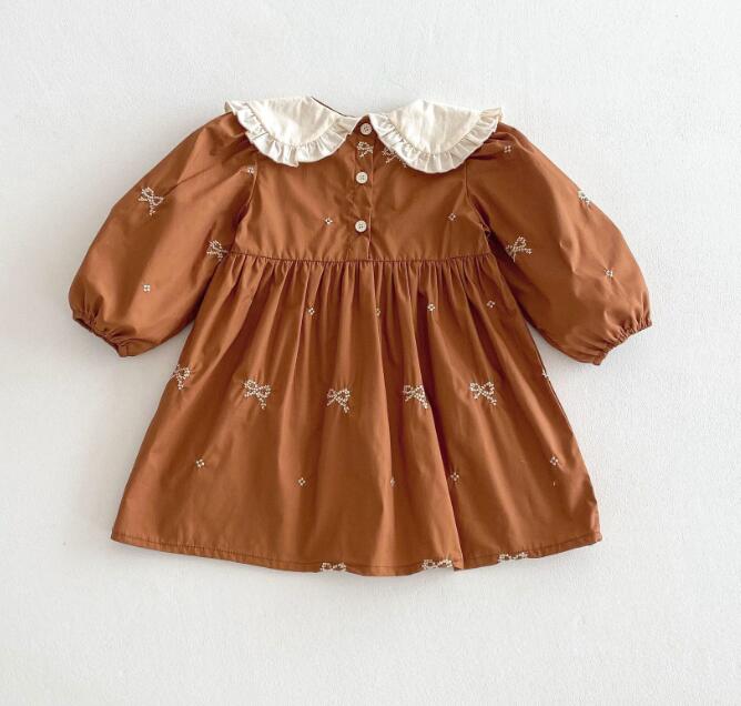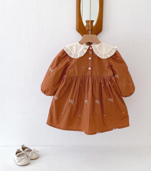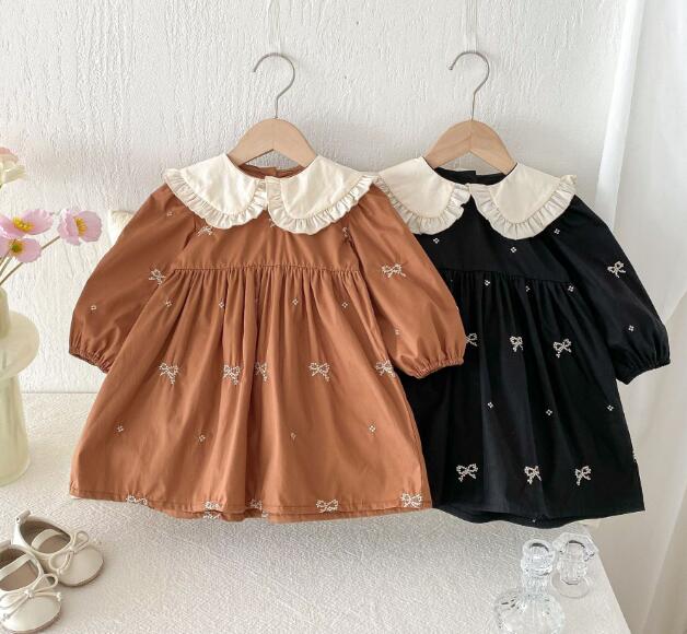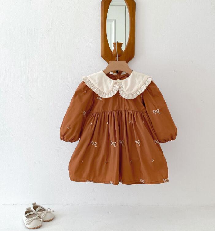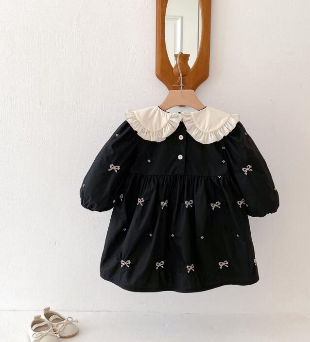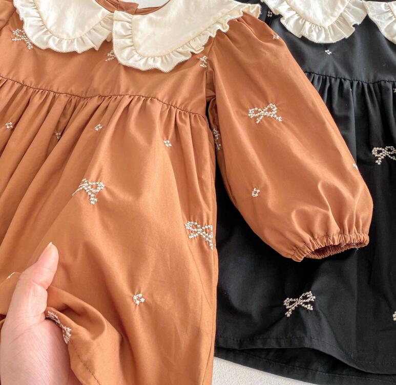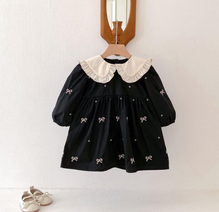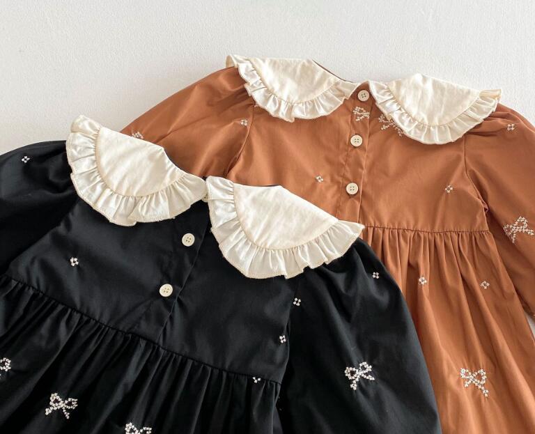 可愛らしいリボン刺繍と丸襟フリルが特徴的なキッズ用ロングワンピースです。
