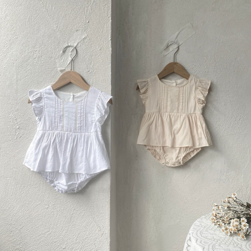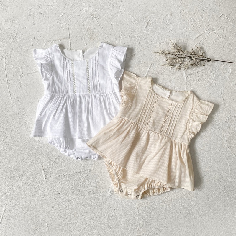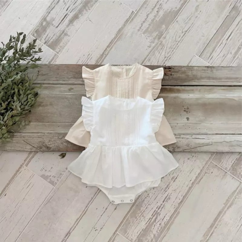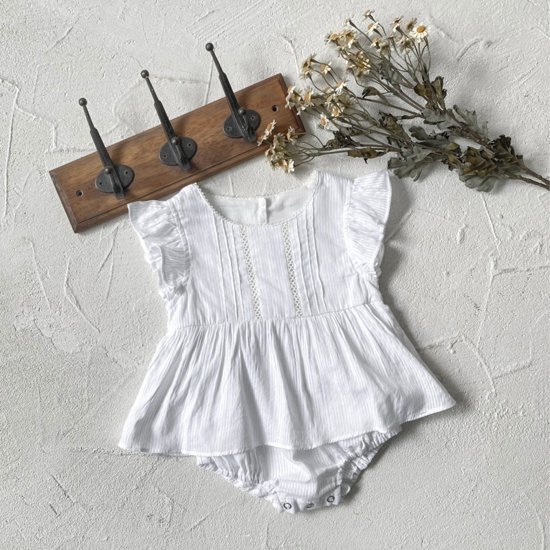 純白のレース装飾とフリル袖が上品で、着心地の良いロングワンピース風のデザインが特徴です。