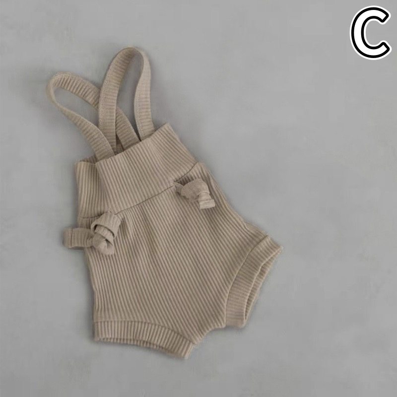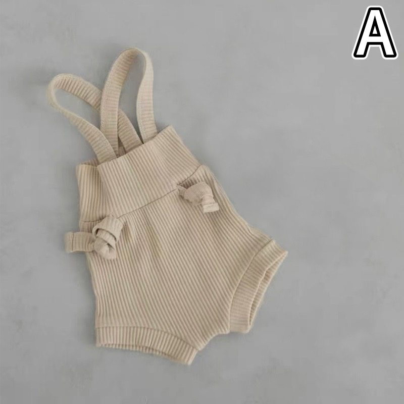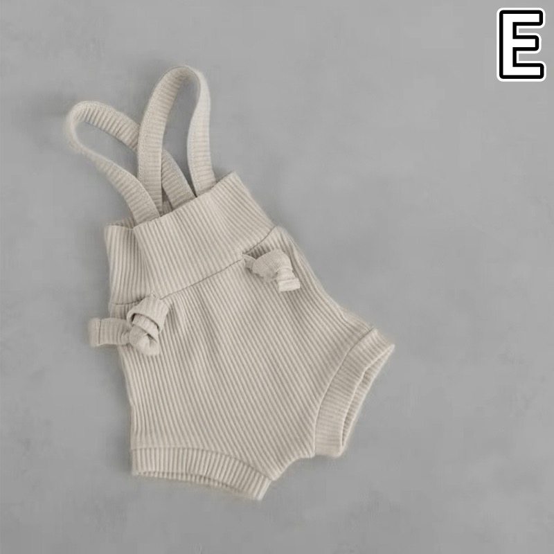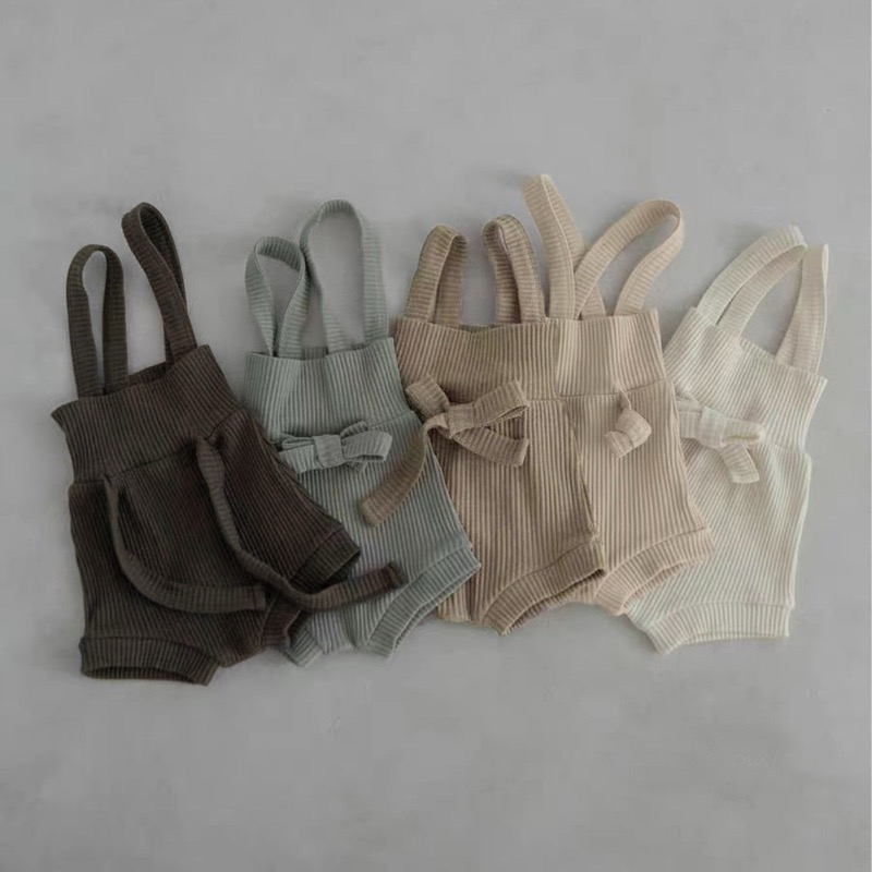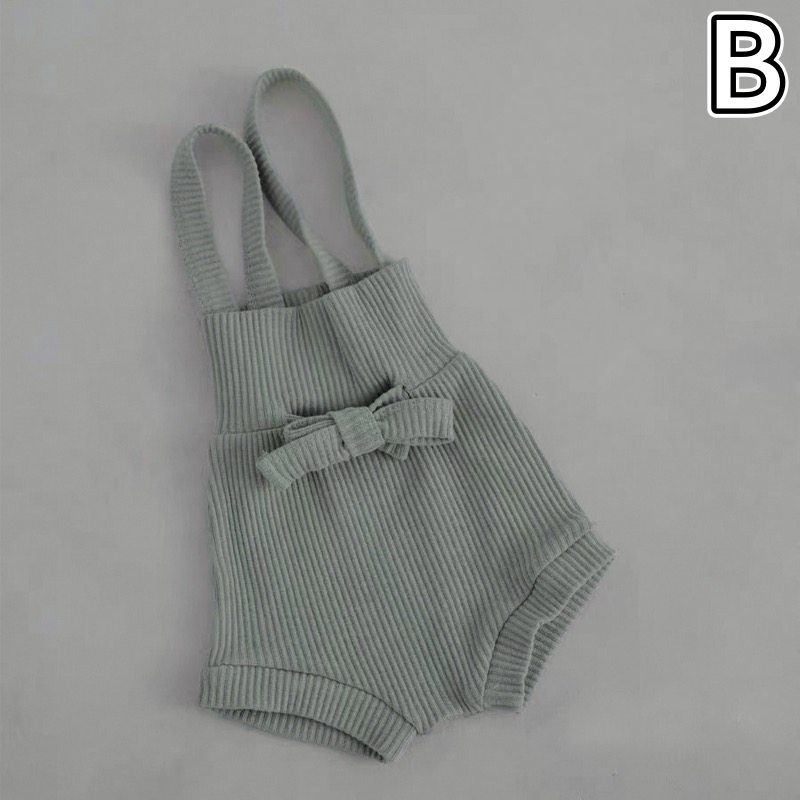 サスペンダー風のストラップと可愛らしいリボンがアクセントになり、カジュアルからお出かけスタイルまで幅広く活躍します。