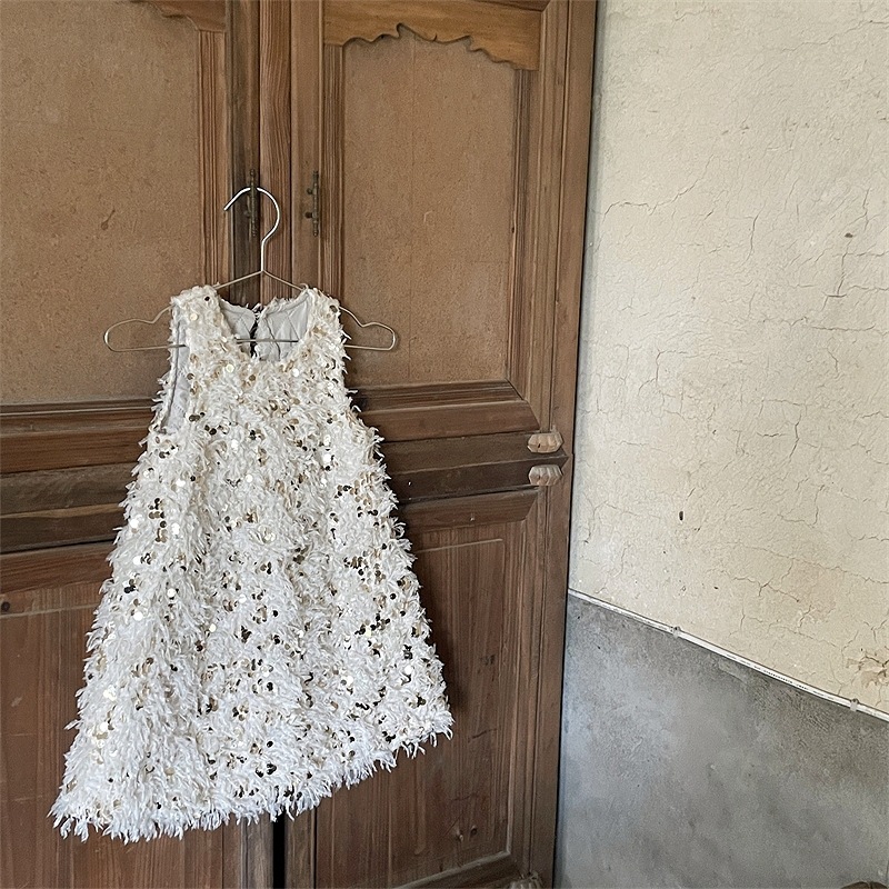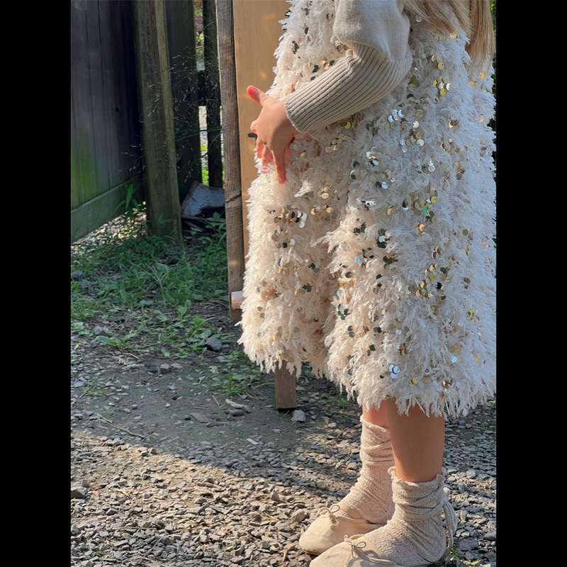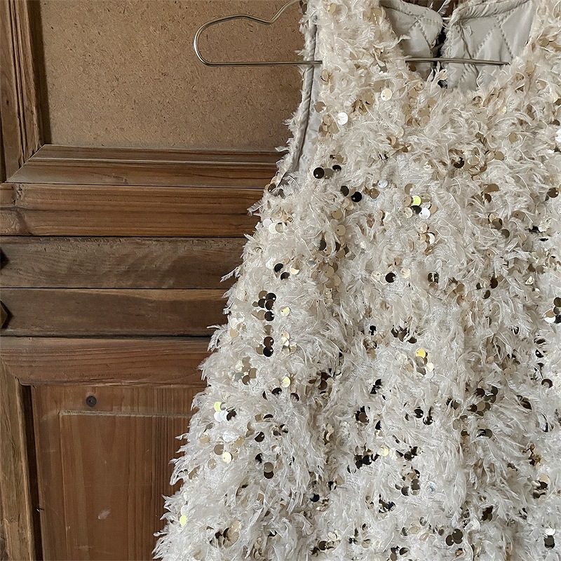全体に施された美しい羽根装飾とスパンコールが特別な日を彩ります。