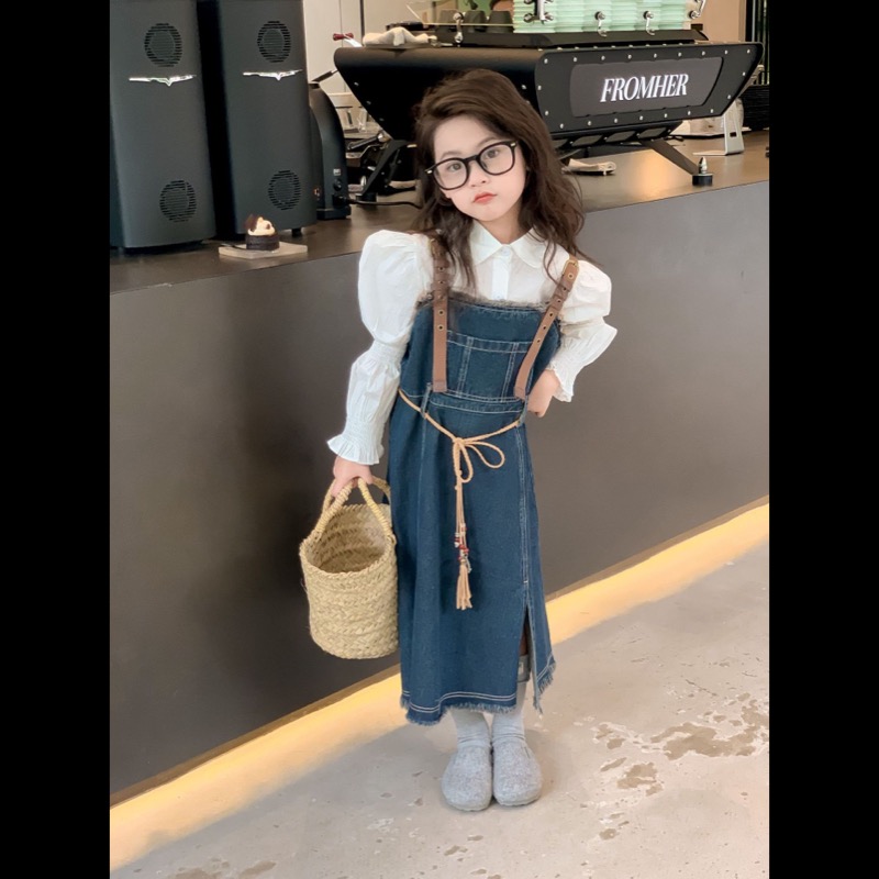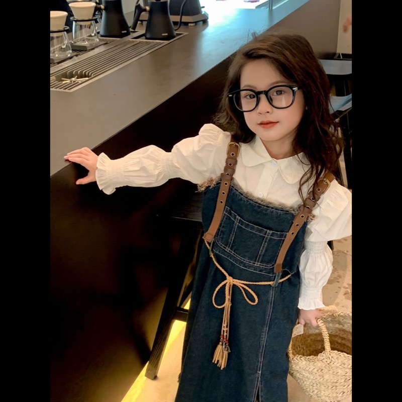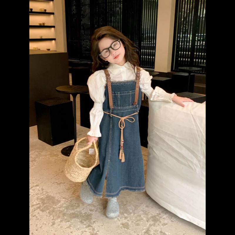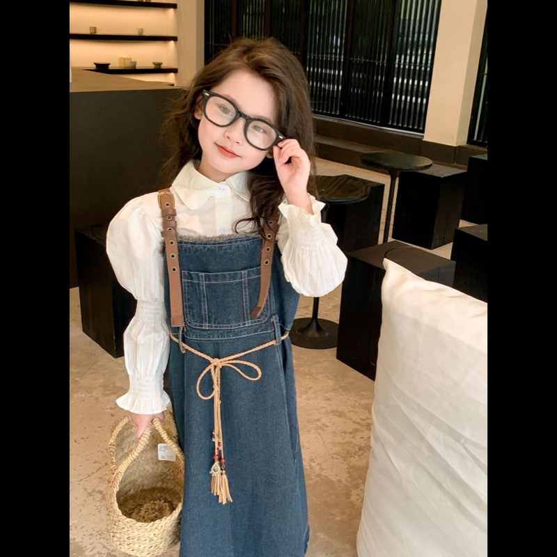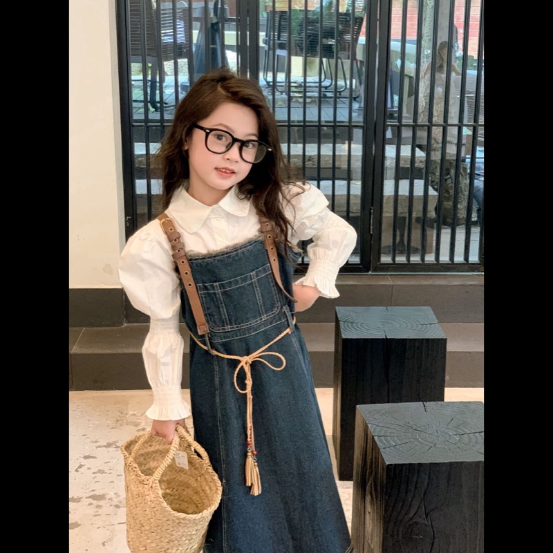 キッズ向けの白シャツとデニムサロペットワンピースのセットです。