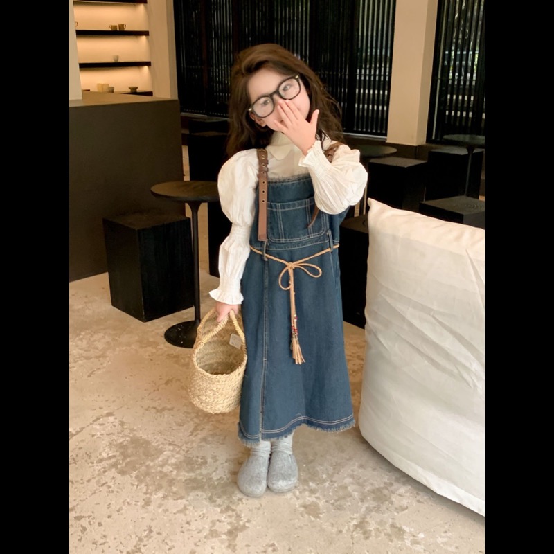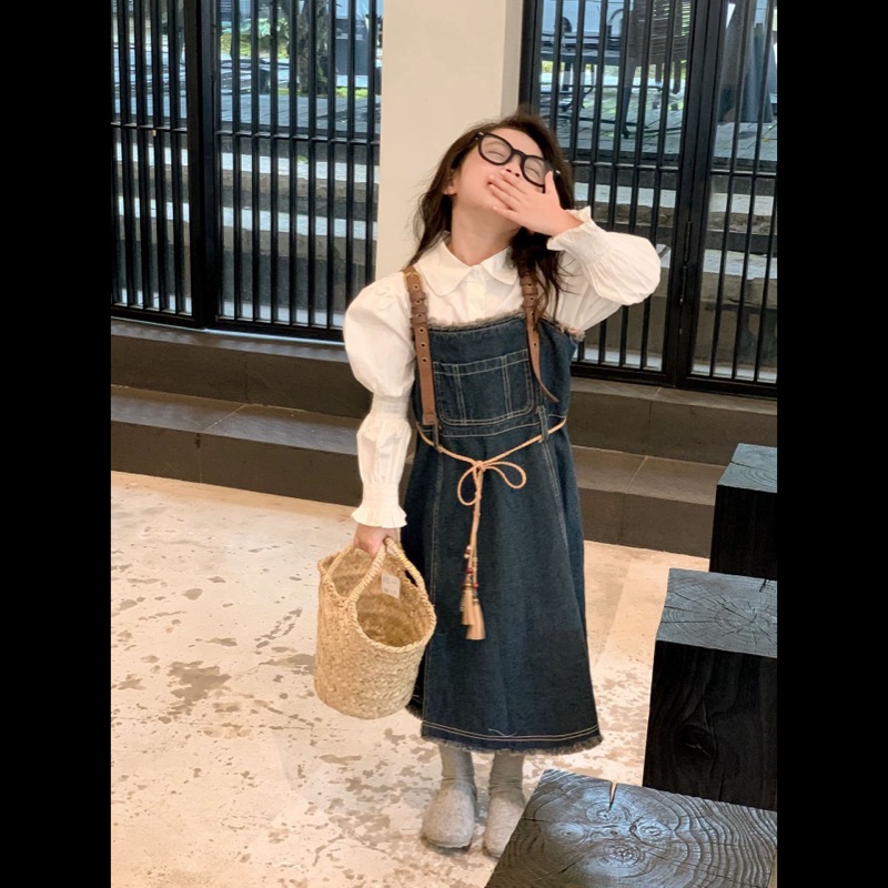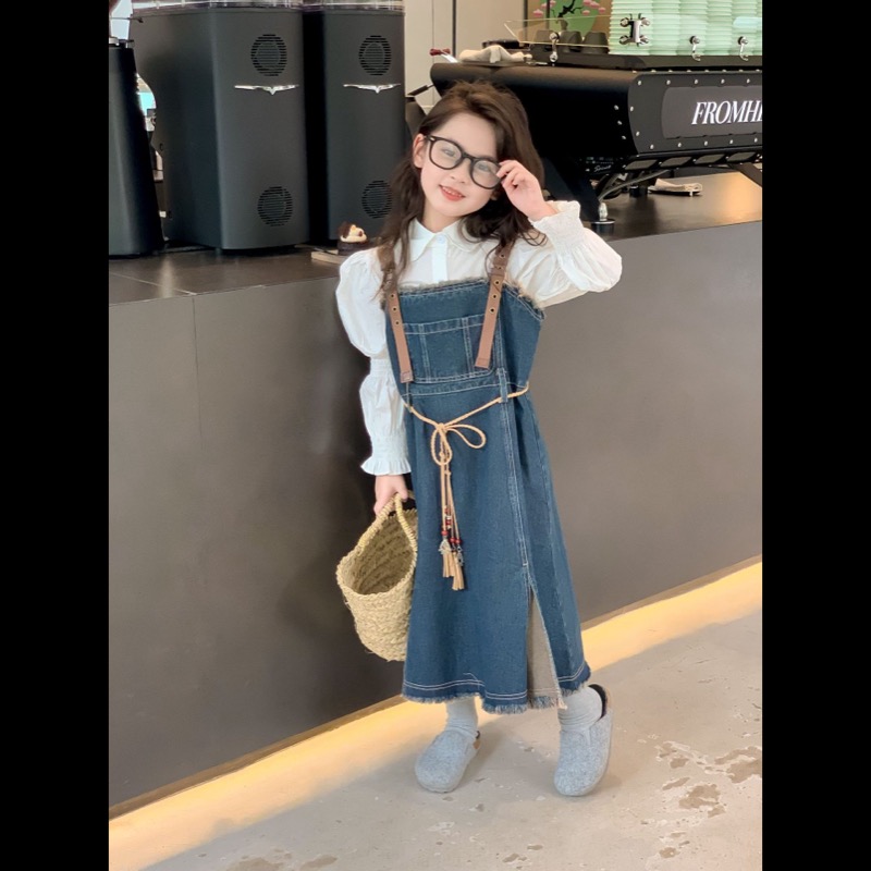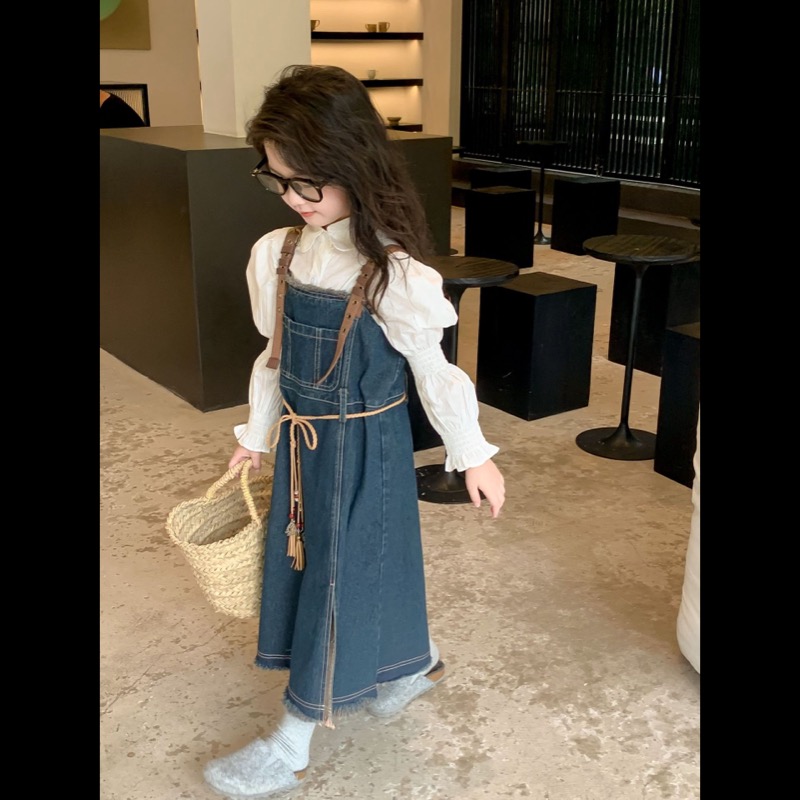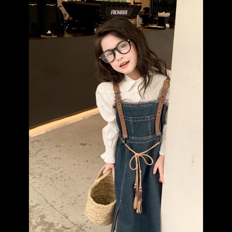 キッズ向けの白シャツとデニムサロペットワンピースのセットです。
