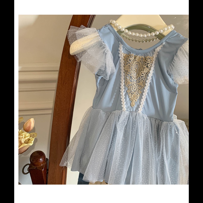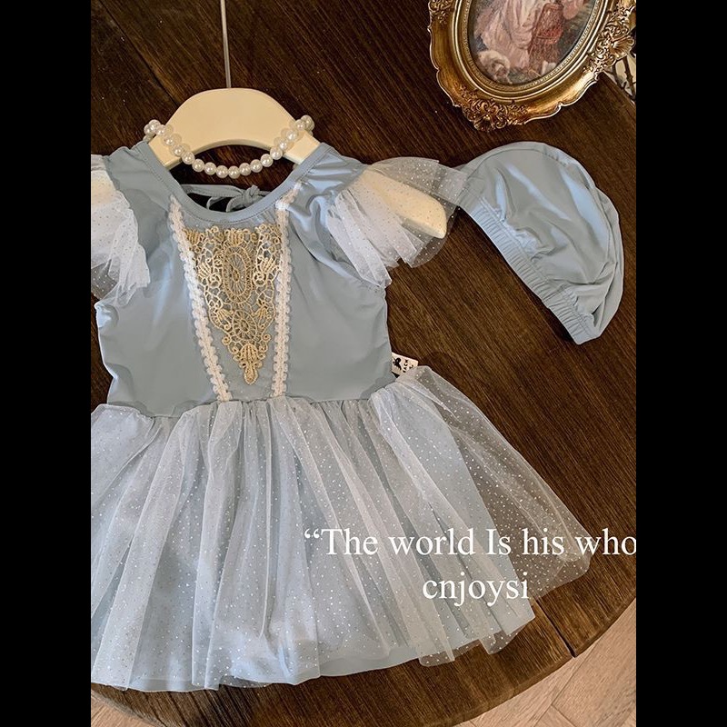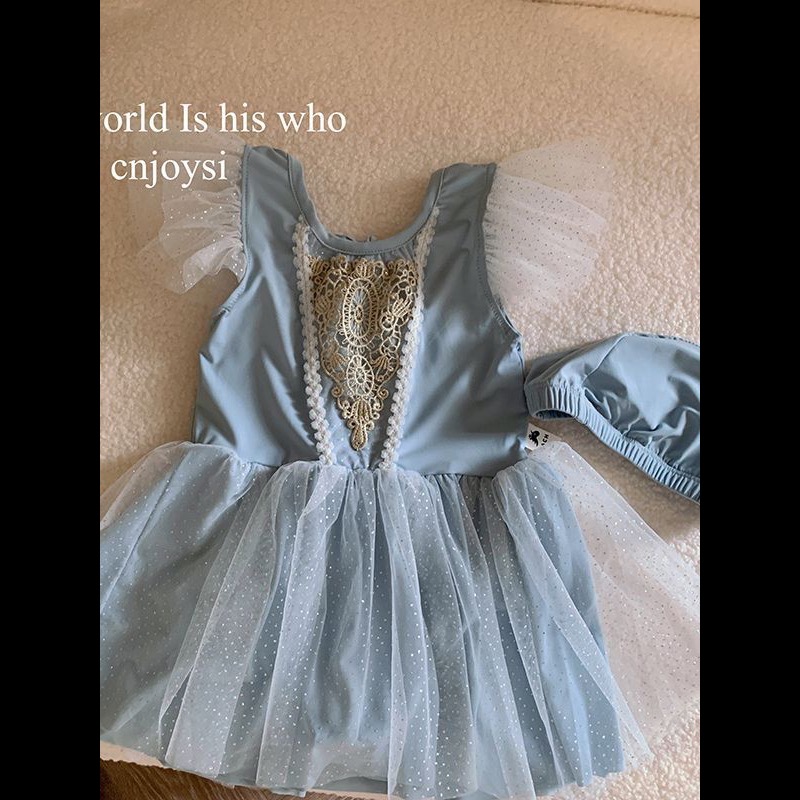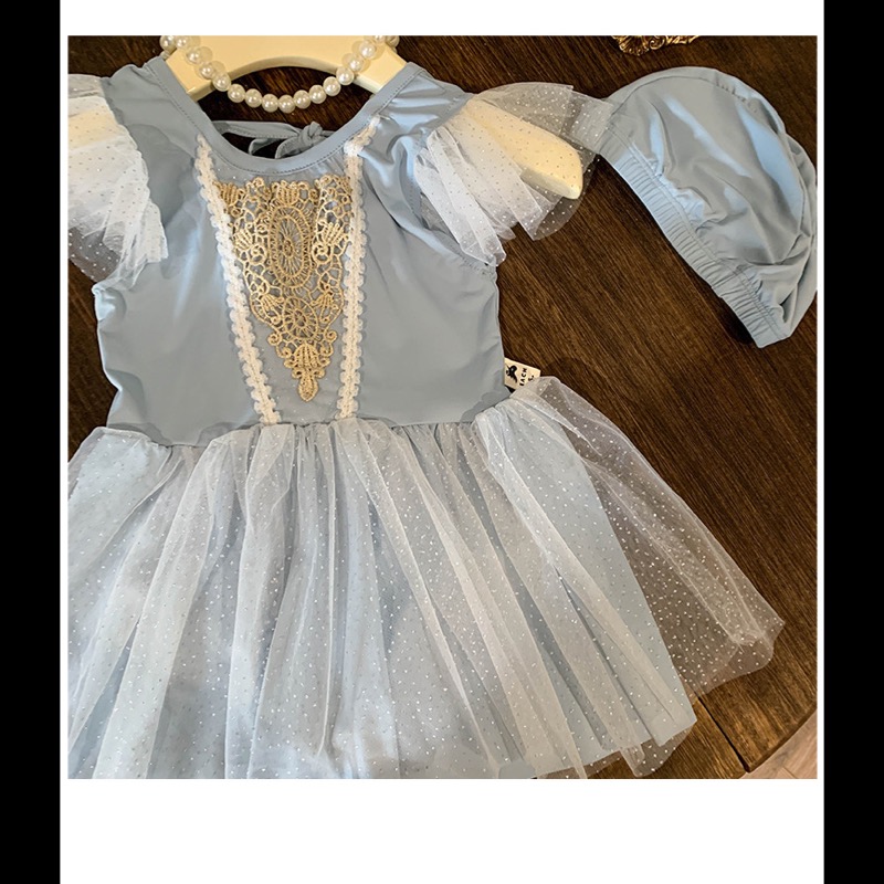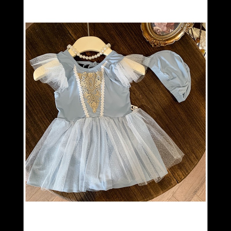 水色の美しい生地にレースとゴールドの装飾が施された特別なデザインで、帽子も付属しています。