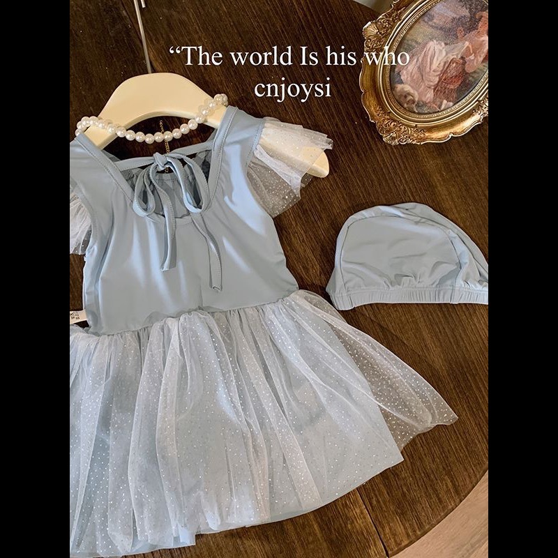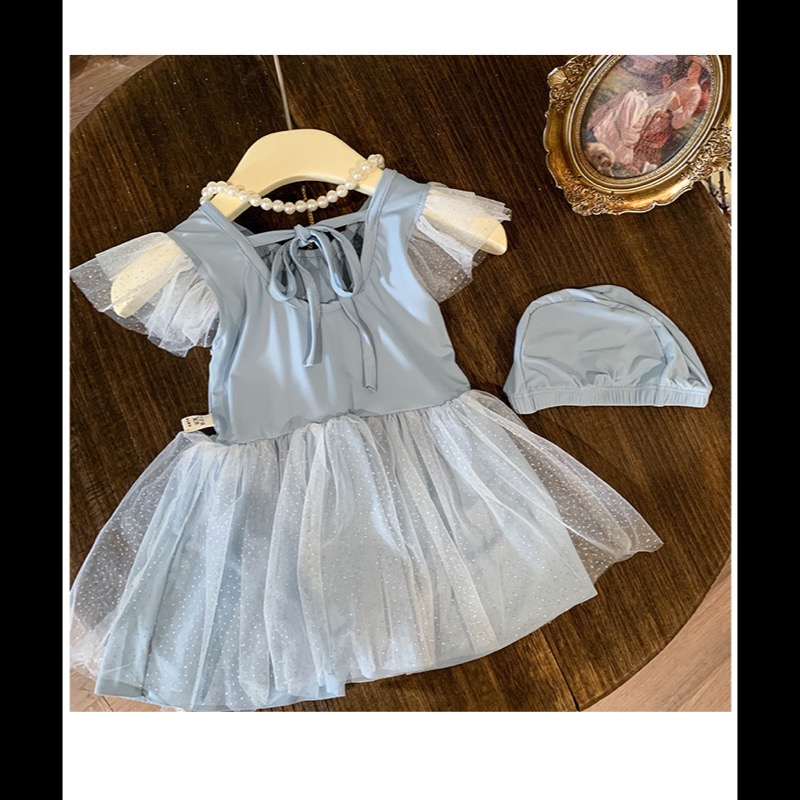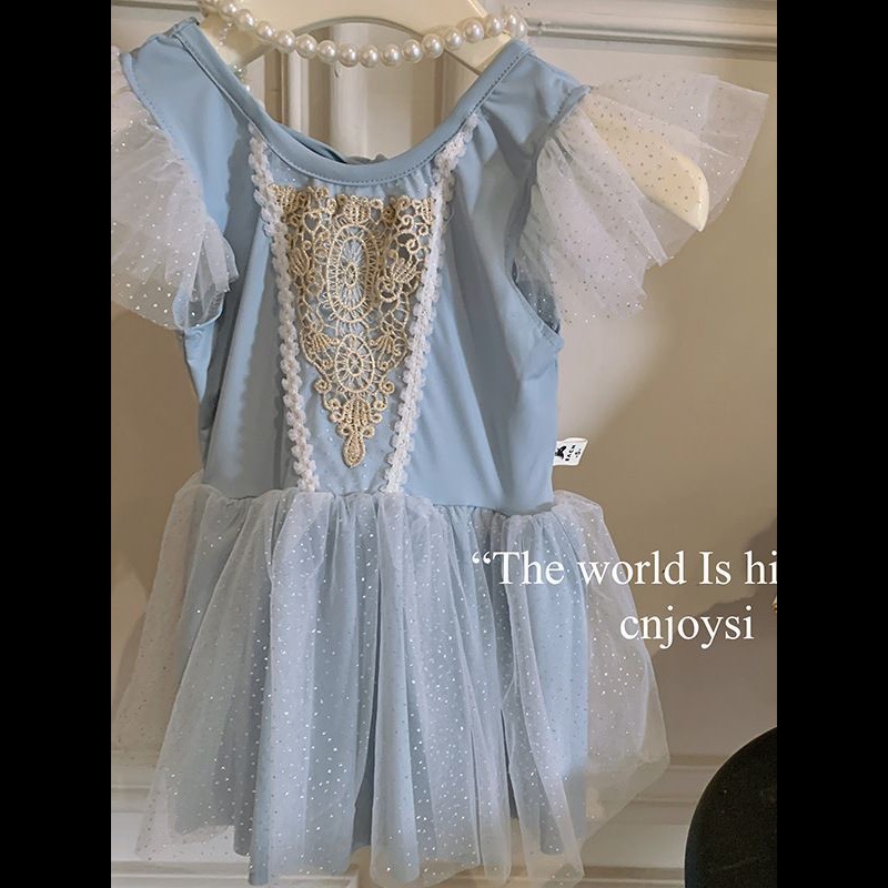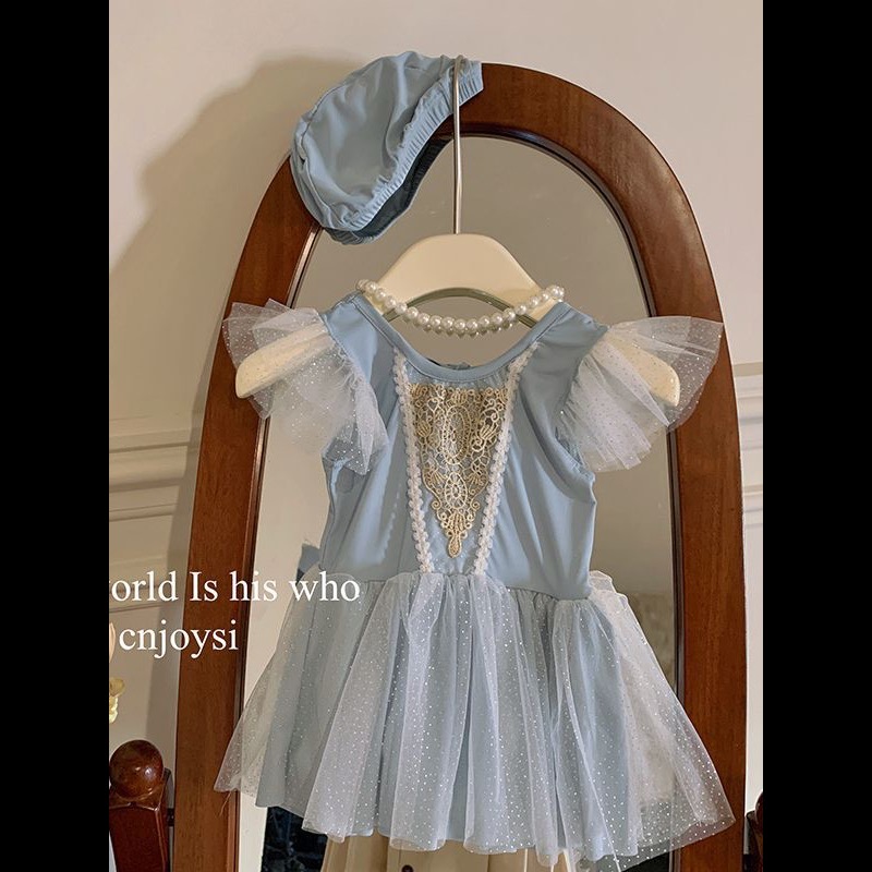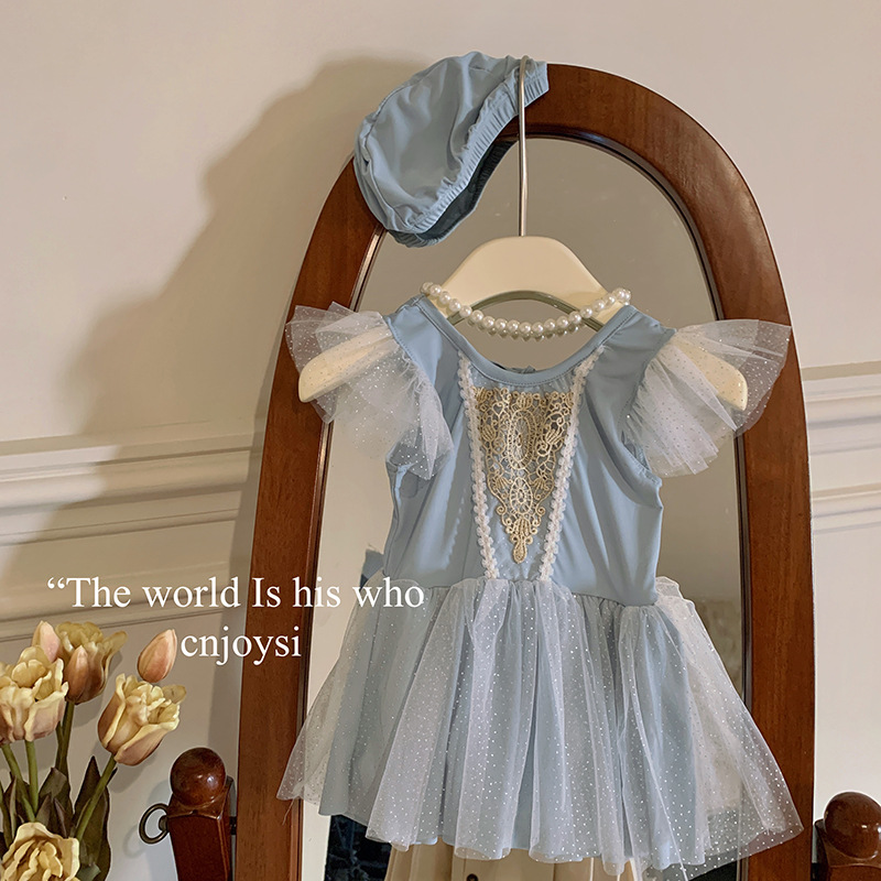水色の美しい生地にレースとゴールドの装飾が施された特別なデザインで、帽子も付属しています。