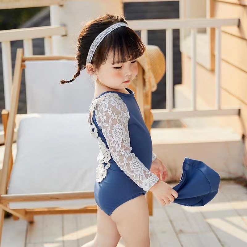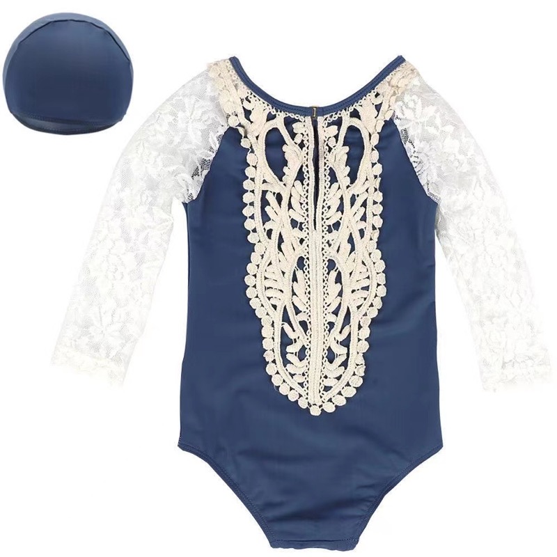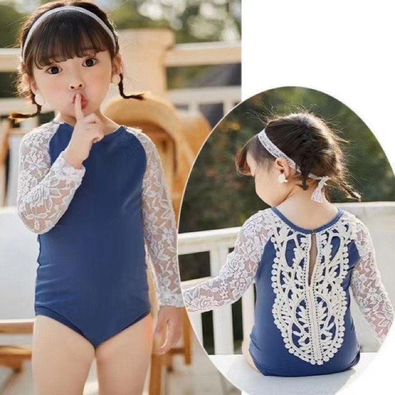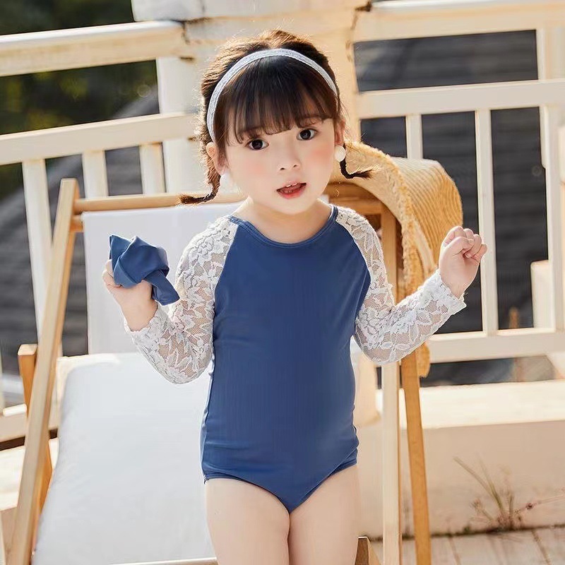 女の子用の優雅で快適な水着です。ロングワンピースタイプで上品なレース袖が特徴的なデザインです。