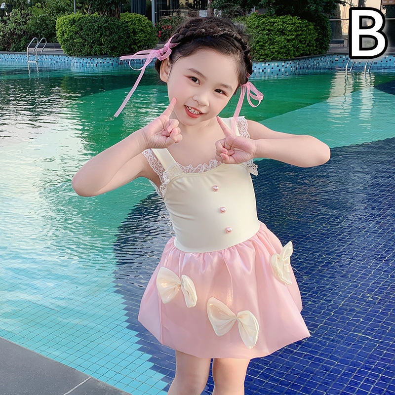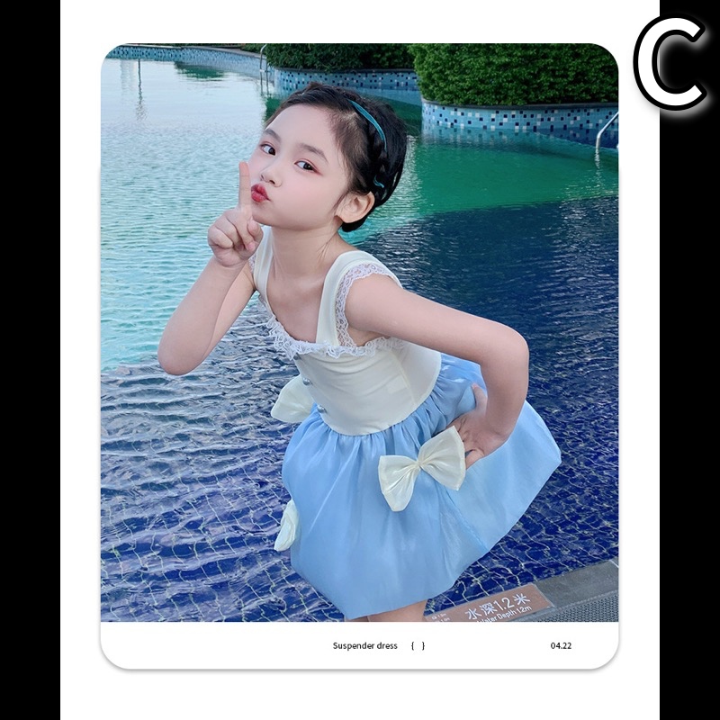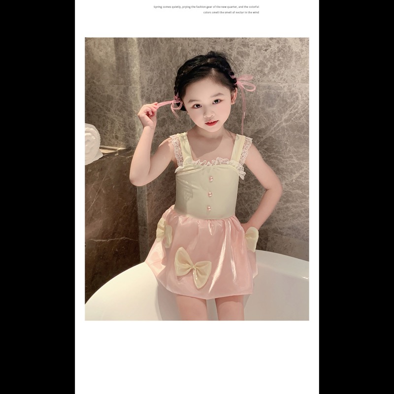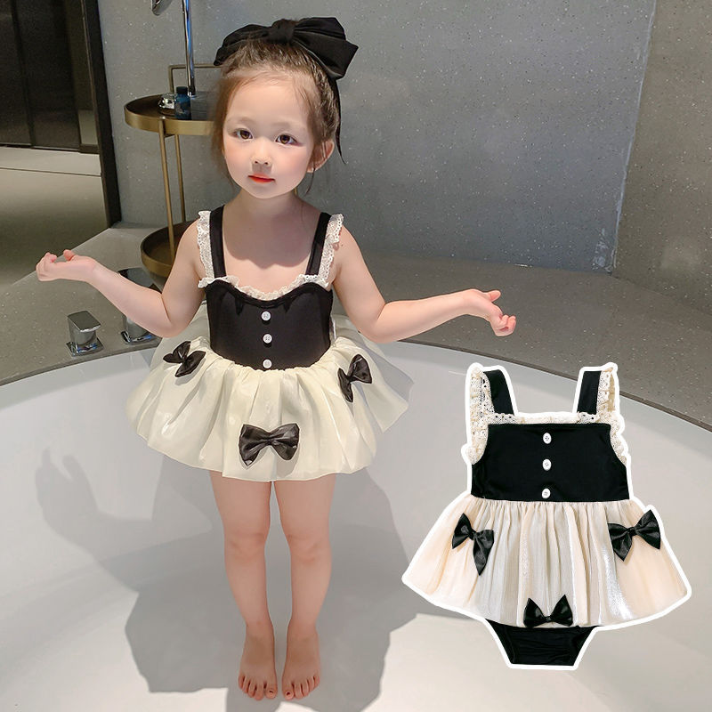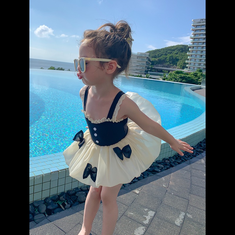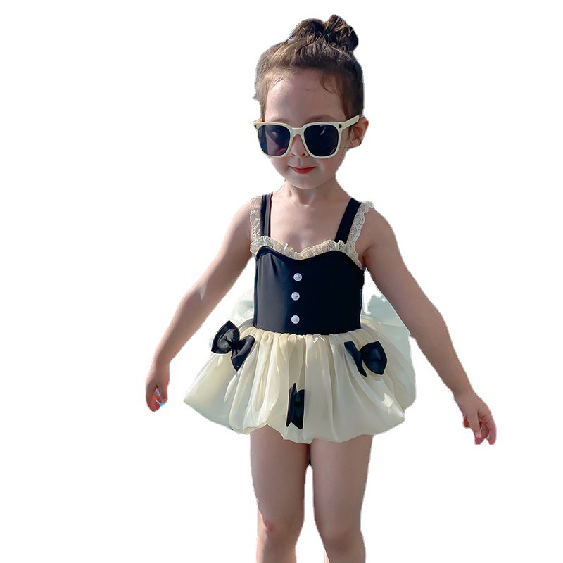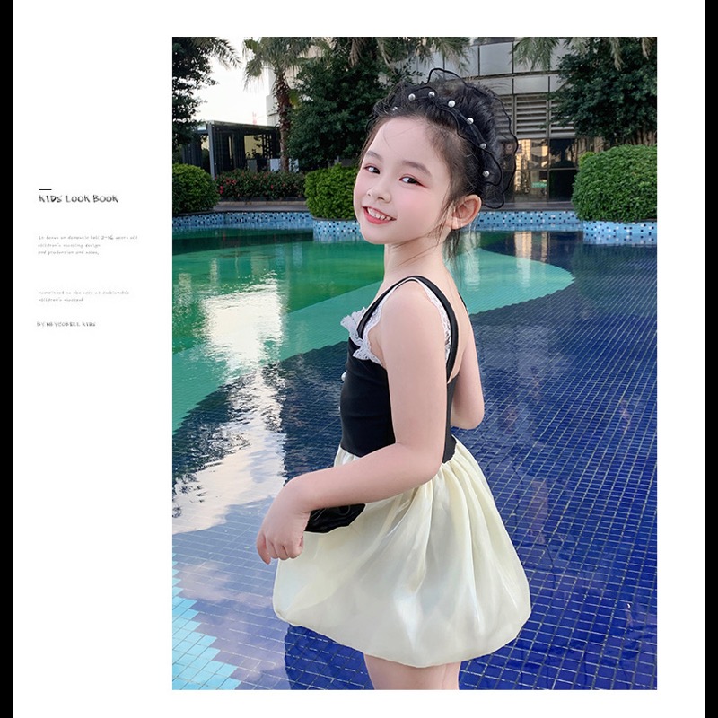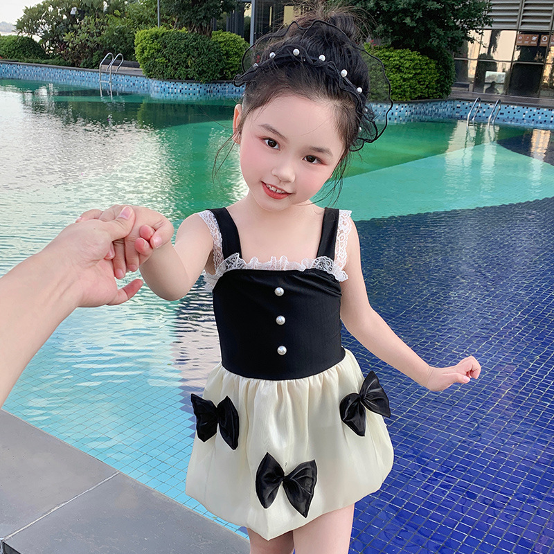 キッズ向けの上品で可愛らしい水着ワンピースです。黒いビスチェ部分に白いレース装飾、
